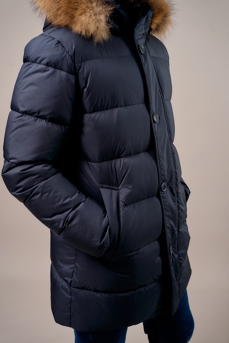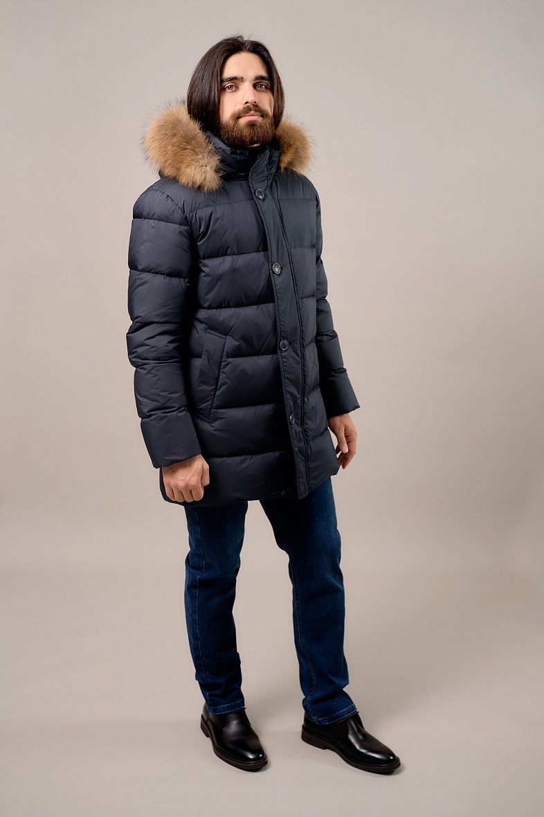Куртка мужская на натуральном пуху с отд. из меха енота и трикотажа синий MADZERINI IGO/U63-14 (сине-чёрный)