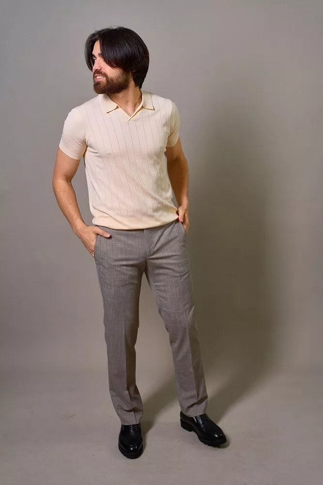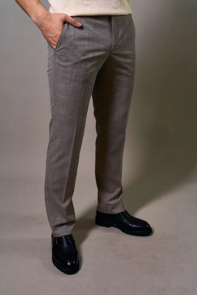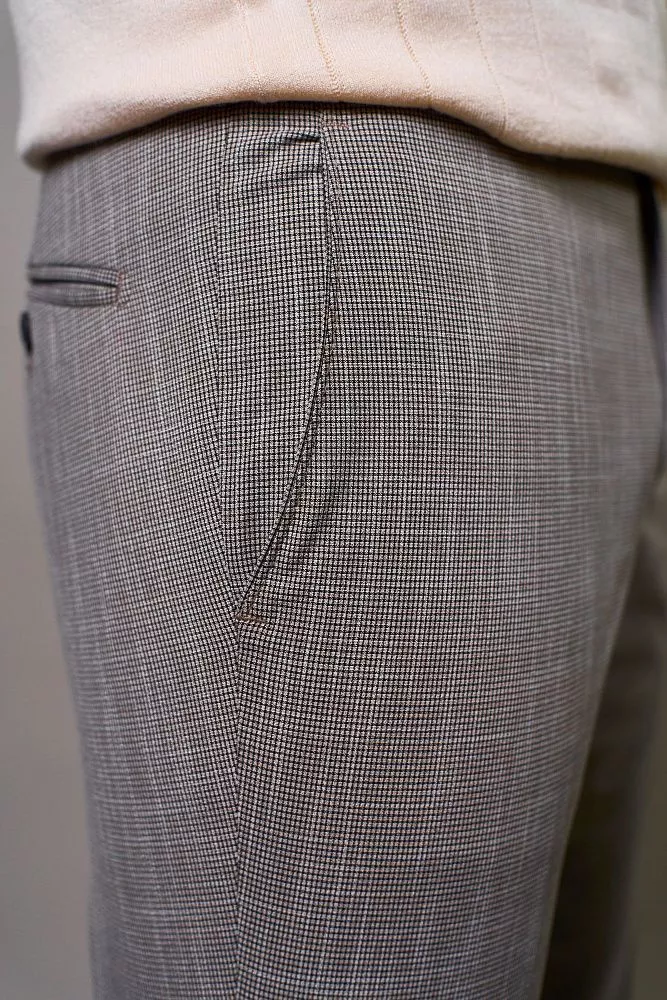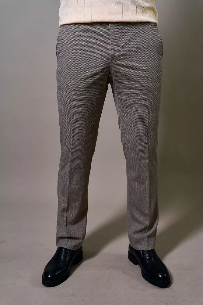 Добавьте утонченность и деловой шик в свой гардероб с этими серо-бежевыми брюками в изящную микроклетку. Четкая стрелка визуально удлиняет силуэт, придавая вашему образу безупречный и собранный вид. Полуприлегающий крой создает современный и выверенный силуэт, выгодно подчеркивая вашу фигуру и обеспечивая комфорт. Смесовый состав ткани гарантирует практичность, долговечность и легкость в уходе, сохраняя идеальный вид брюк надолго. Эти брюки станут идеальной основой как для деловых встреч, так и для элегантных повседневных образов.