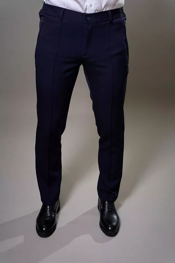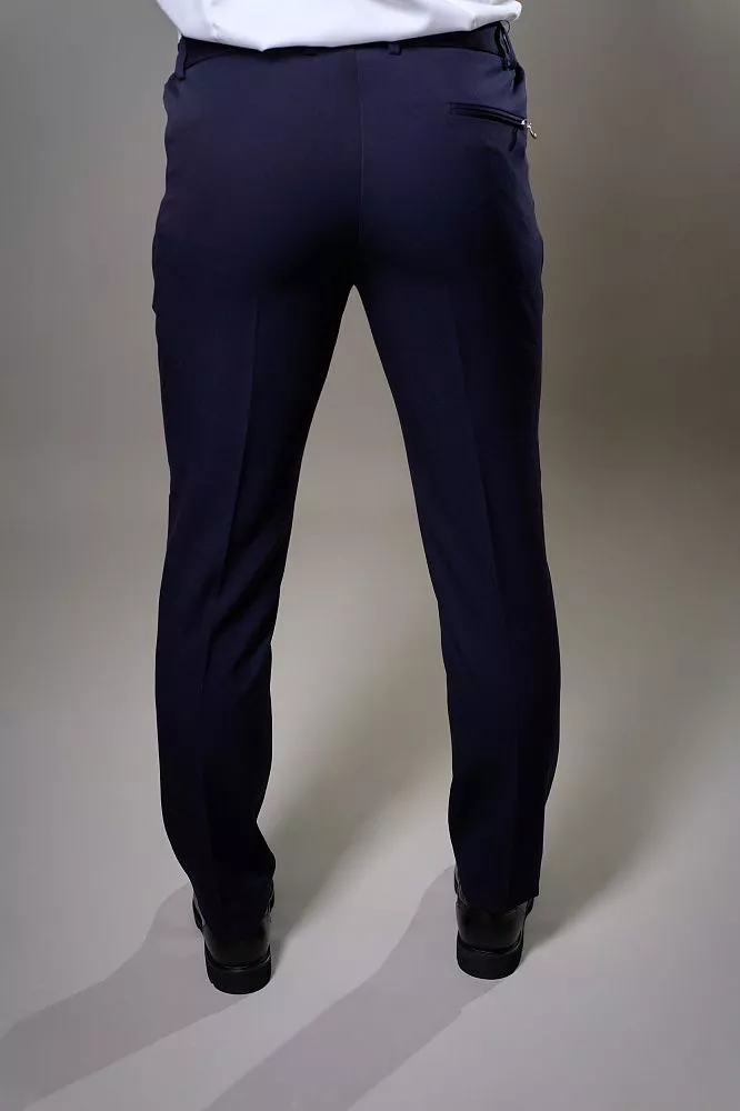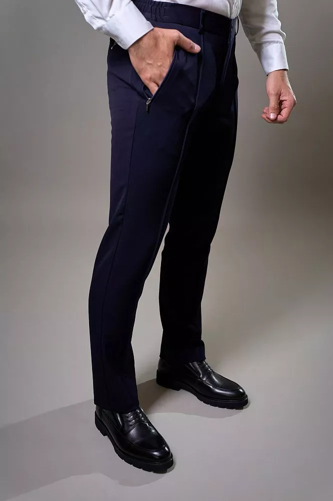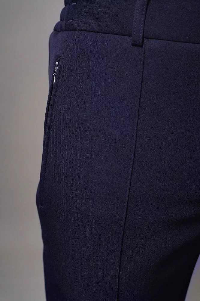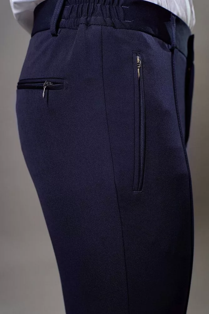 Ощутите новый уровень комфорта и стиля с нашими синими классическими брюками. Их прилегающий крой и четкая стрелка элегантно подчеркнут вашу фигуру, создавая безупречный образ. Эластичный смесовый состав с шерстью гарантирует свободу движений и комфорт в течение всего дня. А боковые карманы на молнии и пояс с резинкой по бокам обеспечат идеальную посадку и надежную сохранность ваших мелочей.