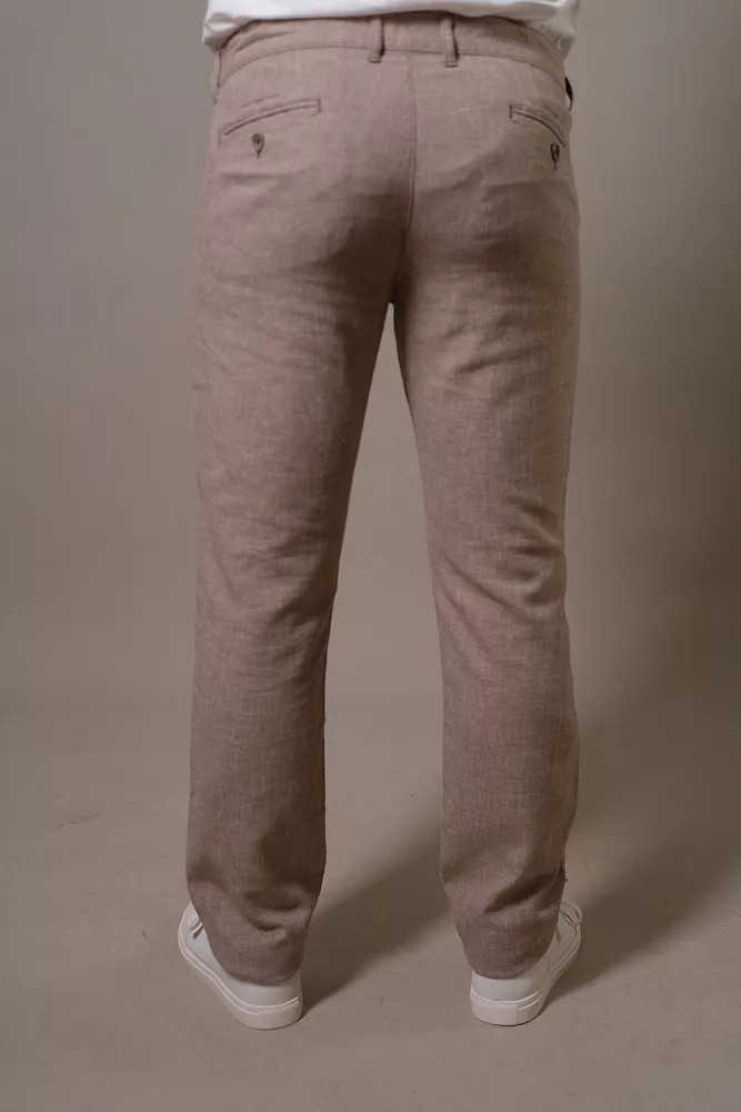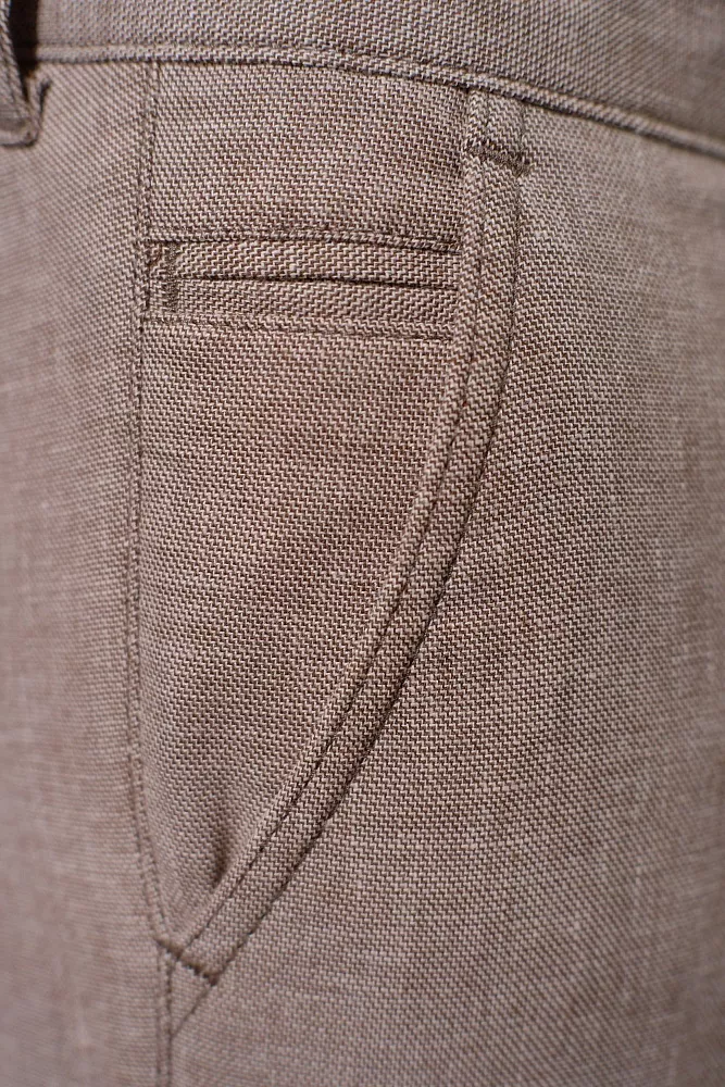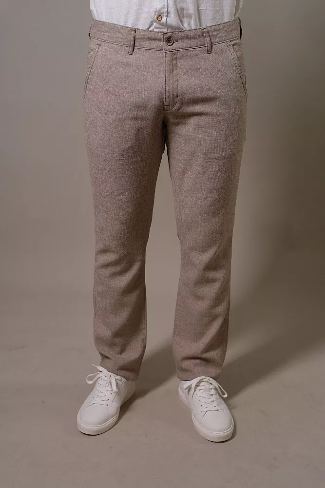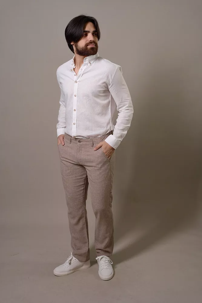 Эти бежевые брюки станут основой вашего гардероба, легко сочетаясь с любыми рубашками и поло. Благодаря льняной фактуре, они дарят ощущение свежести и лёгкости даже в самый жаркий день. Смесовый состав обеспечивает практичность: брюки меньше мнутся и сохраняют отличный вид дольше. Полуприлегающий силуэт элегантно подчеркивает фигуру, обеспечивая при этом полную свободу движений. Идеальный выбор для офиса, отдыха или летних прогулок, гарантирующий ваш безупречный стиль. Эти брюки можно приобрести в голубом цвете с артикулом 70205 Джета.