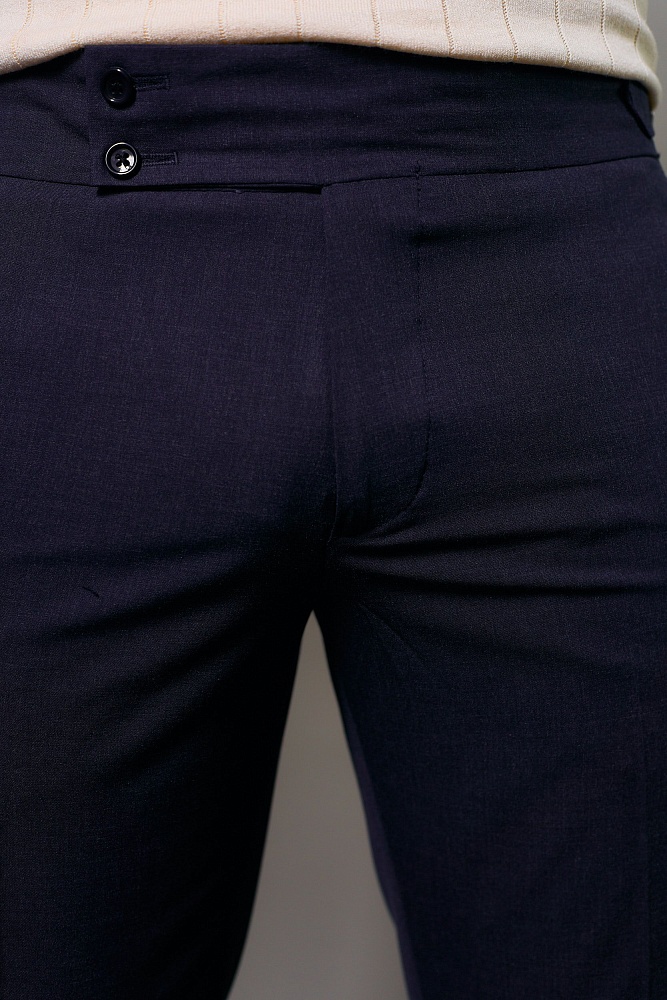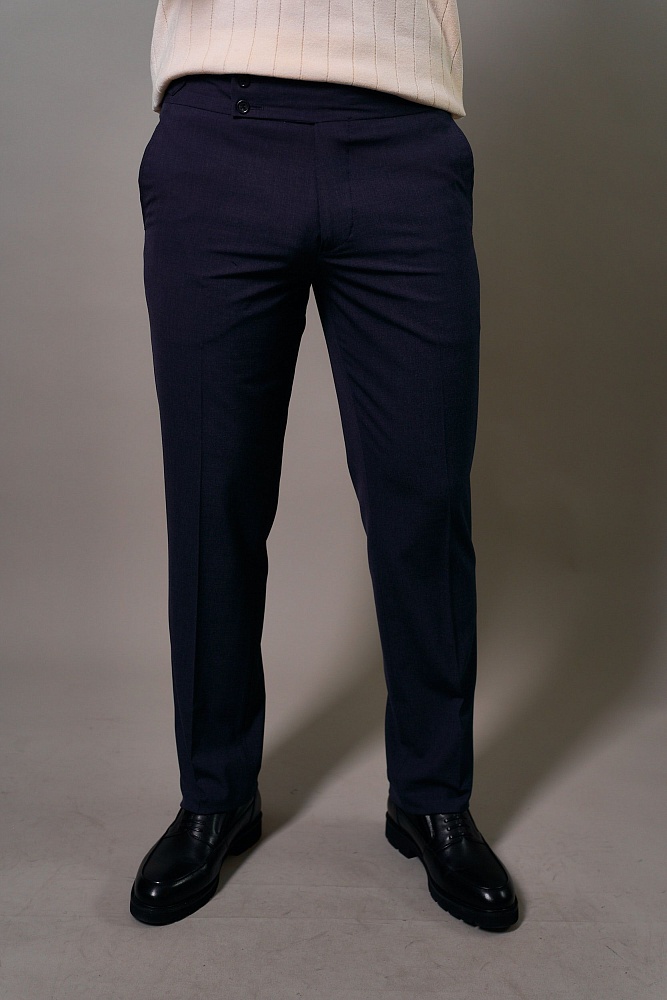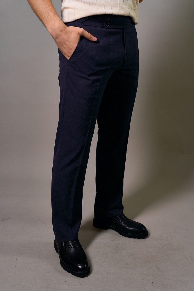 Привнесите изысканность и безупречный стиль в свой гардероб с этими темно-синими брюками гурка (гуркха) со стрелкой. Их фирменный пояс с регулируемыми пряжками гарантирует идеальную посадку и абсолютный комфорт в любой ситуации. Полуприлегающий крой создает современный и выверенный силуэт, выгодно подчеркивающий вашу фигуру. Богатый смесовый состав с шерстью и вискозой обеспечивает приятные тактильные ощущения, а эластан дарит свободу движений и превосходное сохранение формы.
