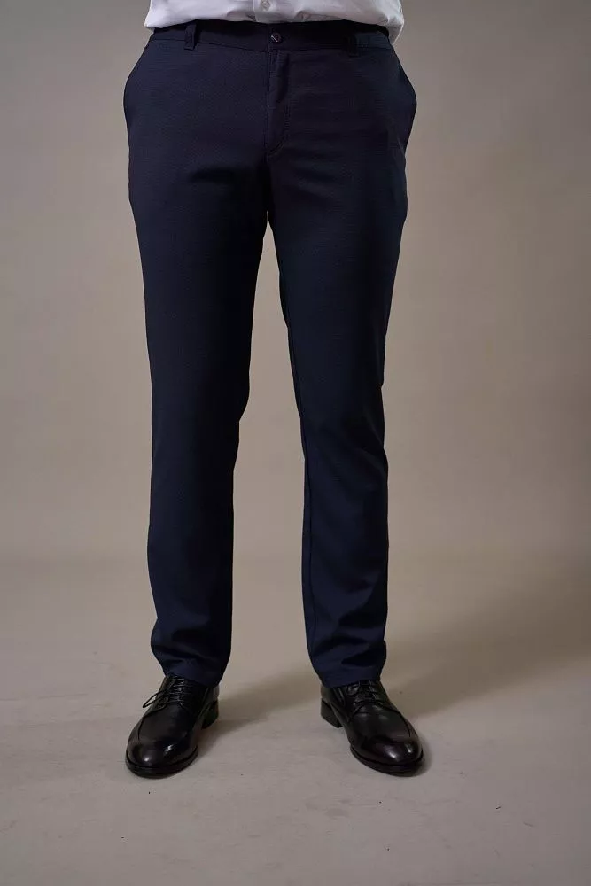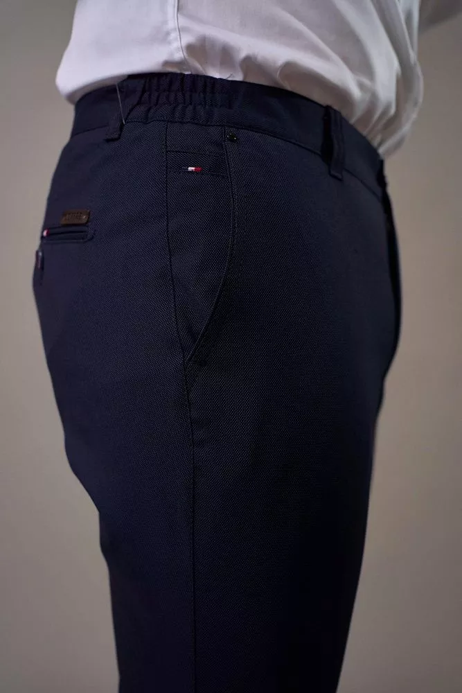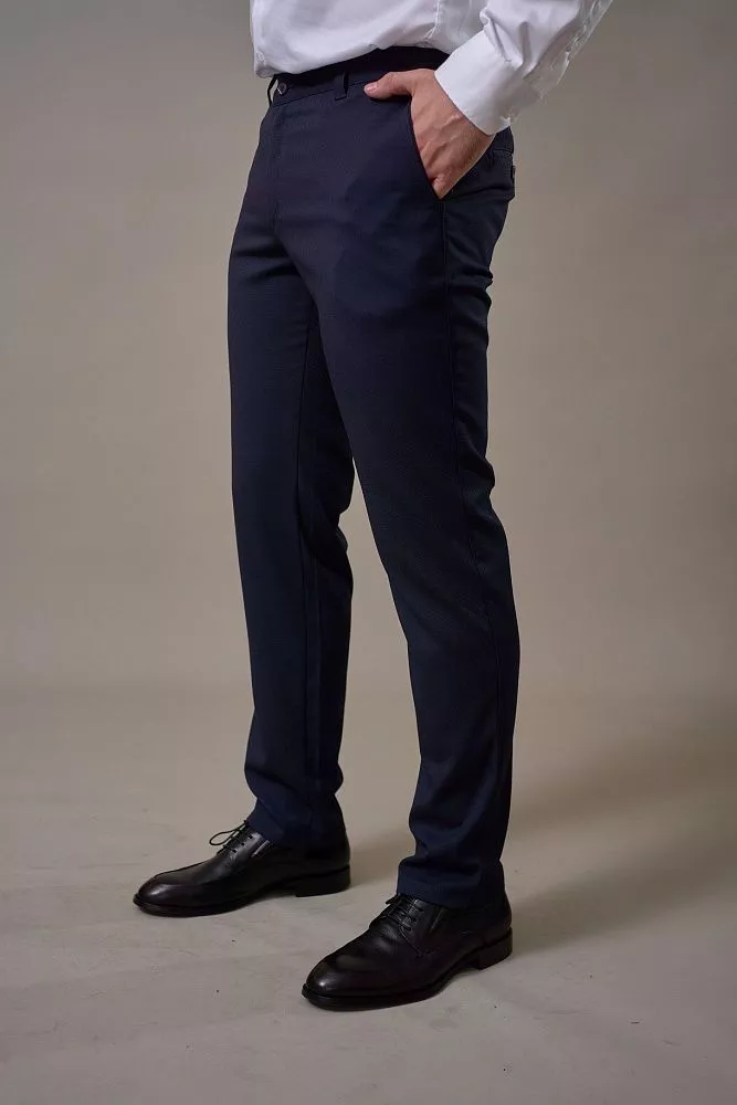 Синие брюки с мелкой фактурой идеально впишутся в гардероб любого мужчины. Прямой крой обеспечивает свободу движений, а удобная резинка по бокам пояса гарантирует идеальную посадку без сдавливания. Отсутствие стрелки придает образу непринужденность и подходит для различных стилей. Приятная на ощупь ткань с мелкой фактурой добавляет изюминку. Смесовый материал гарантирует долговечность и сохраненность формы после стирки.