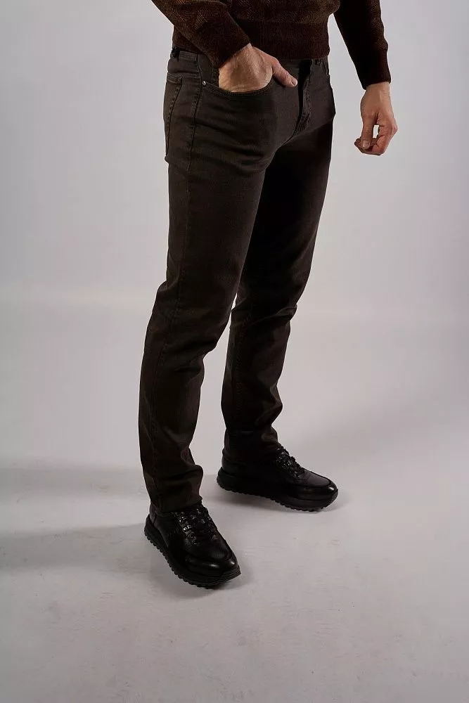 Мужские джинсы тёмно‑серого цвета с лёгким коричневым подтоном подходят для сезона осень‑зима. Модель имеет прилегающий крой, который аккуратно подчёркивает фигуру, не сковывая движений. Ткань состоит из 58 % хлопка, 48 % вискозы и 2 % эластана — это обеспечивает комфорт, мягкость и хорошую эластичность. Брюки сочетают практичность и стильный внешний вид, идеально подходят для повседневных образов.
