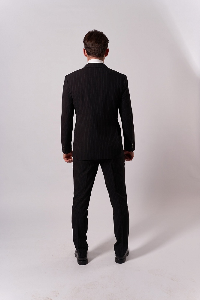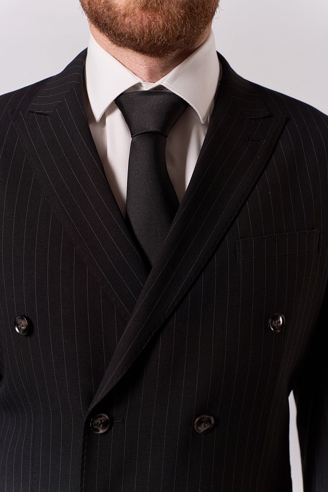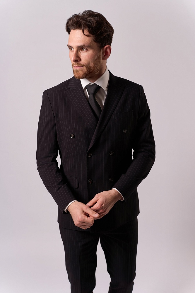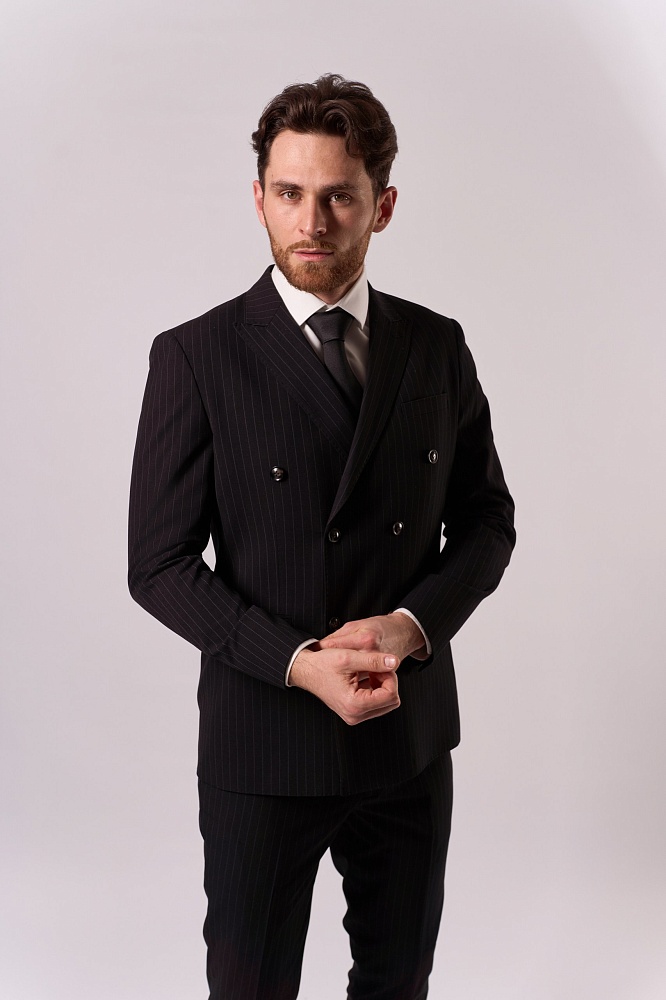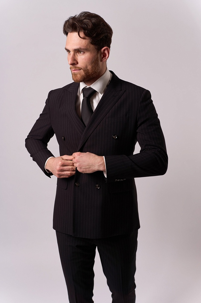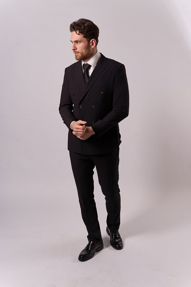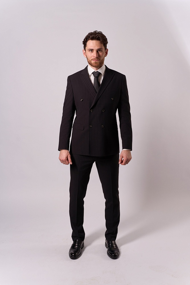Изысканный двубортный костюм-двойка в чёрно-белую полоску — воплощение классического стиля для сезона весна–лето. Приталенный крой подчёркивает фигуру, создавая лаконичный и респектабельный силуэт. Состав ткани (67% полиэстер, 30% вискоза, 3% эластан) обеспечивает комфорт в носке: костюм не сковывает движения, отлично держит форму и сохраняет безупречный вид в течение всего дня. Идеальный выбор для деловых встреч, торжественных мероприятий и создания стильного образа с нотками утончённой классики.