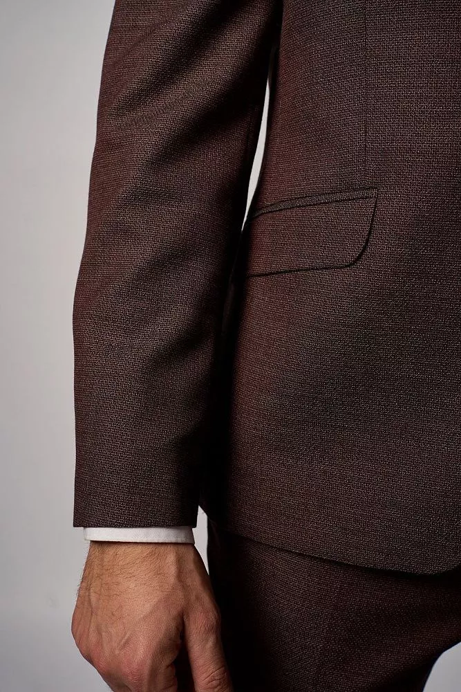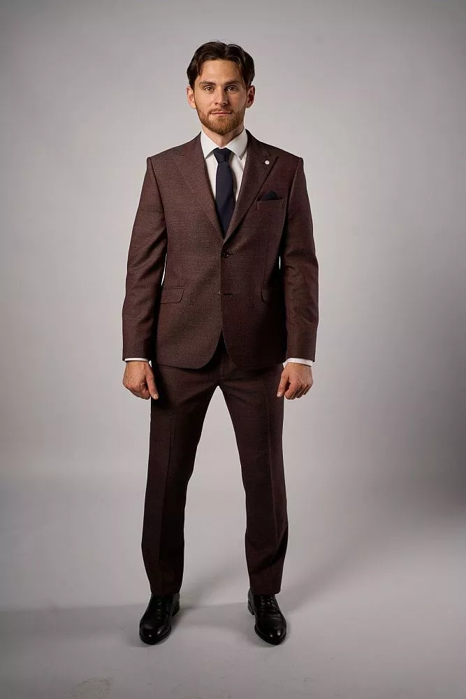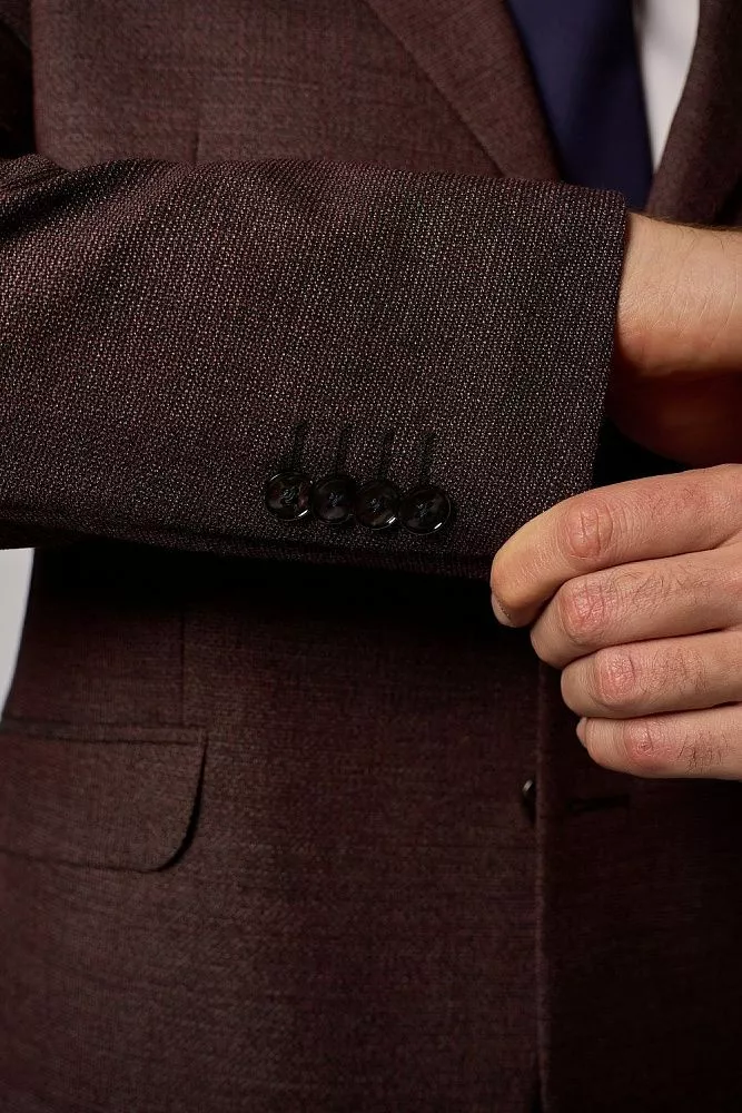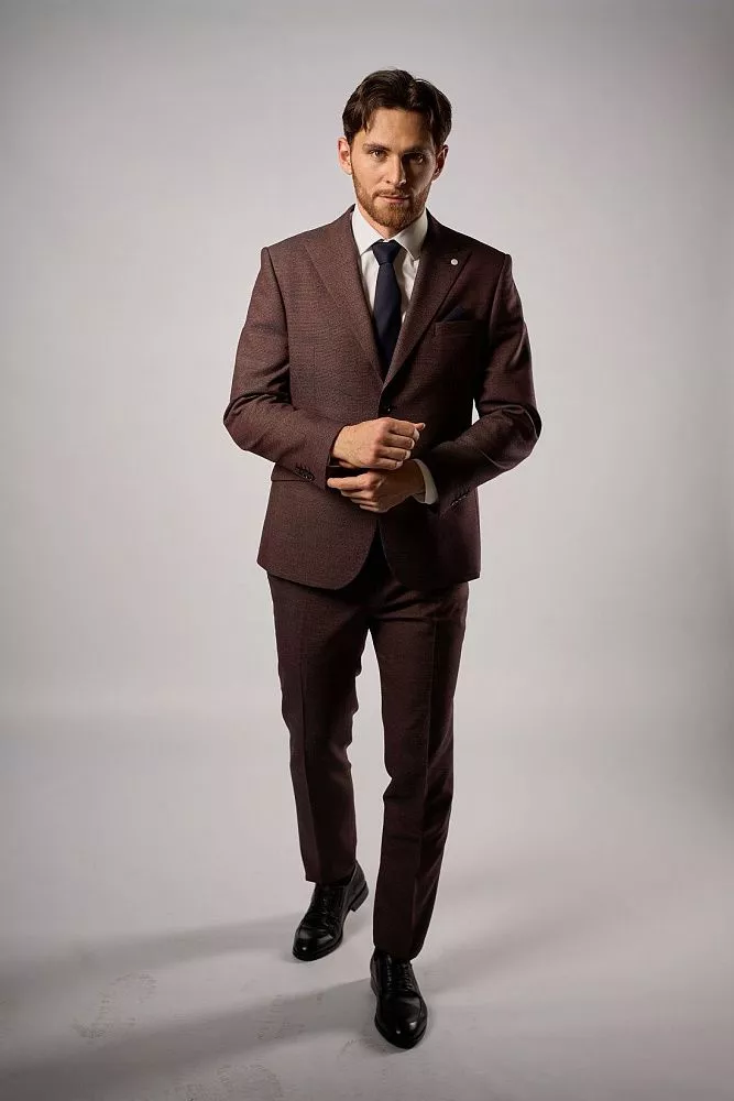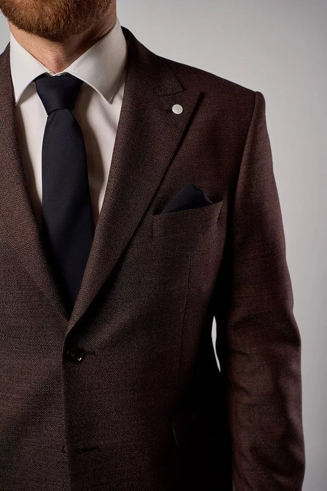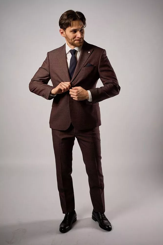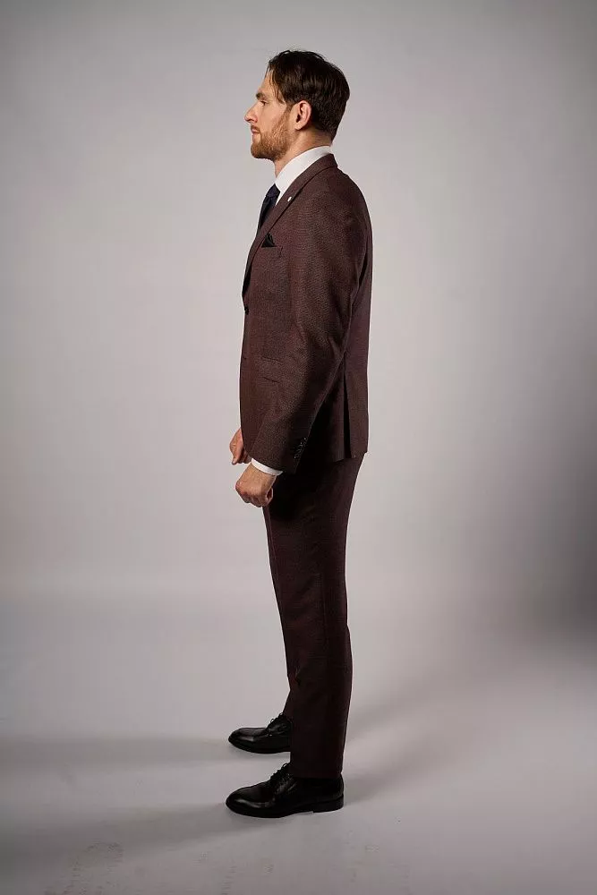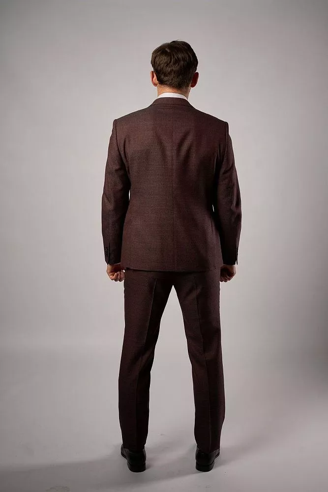 Мужской костюм‑двойка бордового цвета предназначен для сезона осень‑зима. Модель выполнена в классическом стиле с приталенным силуэтом, который выгодно подчёркивает фигуру. Фактурная ткань придаёт изделию выразительную текстуру и солидный внешний вид. Насыщенный бордовый оттенок делает костюм стильным и уместным как для деловых встреч, так и для торжественных мероприятий. Комплект состоит из пиджака и брюк, гармонично сочетающихся между собой по цвету и фактуре.