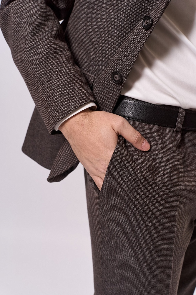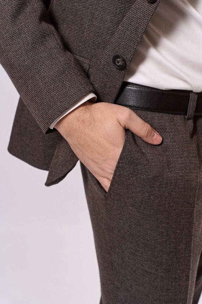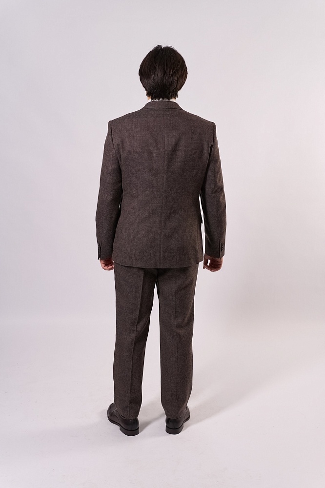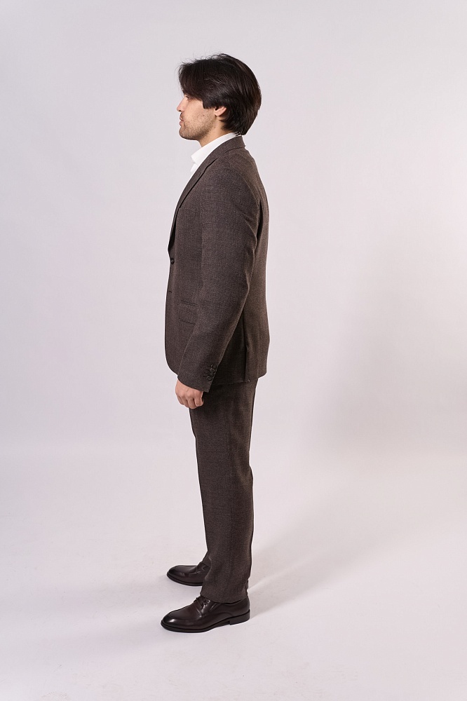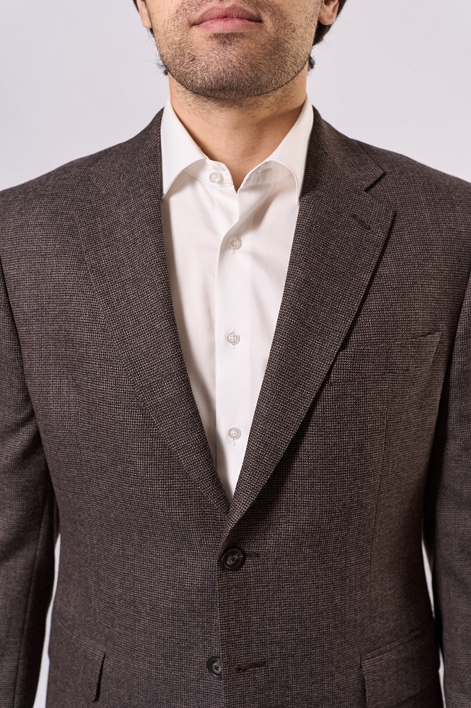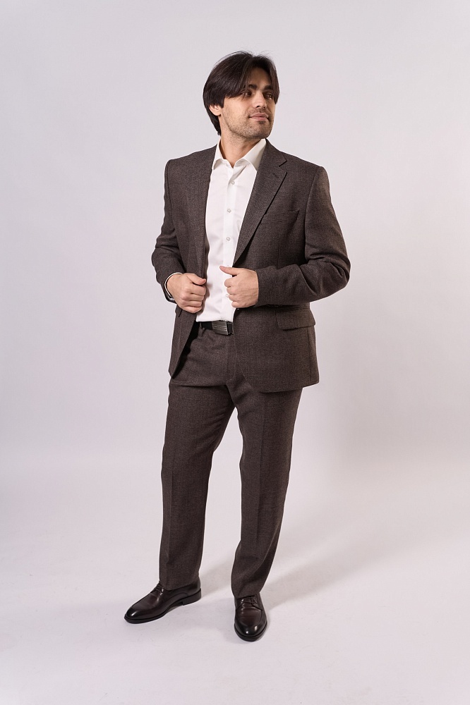 Коричневый классический костюм-двойка — стильное решение для весны и лета. Приталенный крой подчёркивает фигуру, а фактурная ткань придаёт образу элегантность. Комплект состоит из пиджака и брюк в едином оттенке, гармонично сочетается с белой рубашкой. Практичный и универсальный вариант для деловых встреч и торжественных мероприятий.