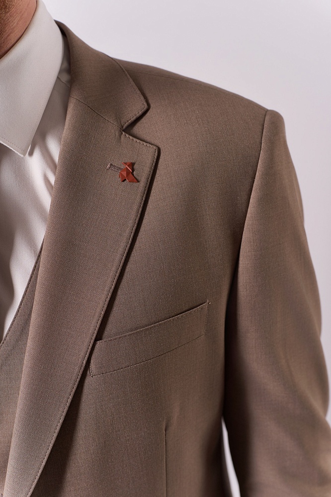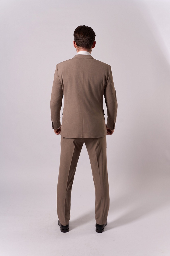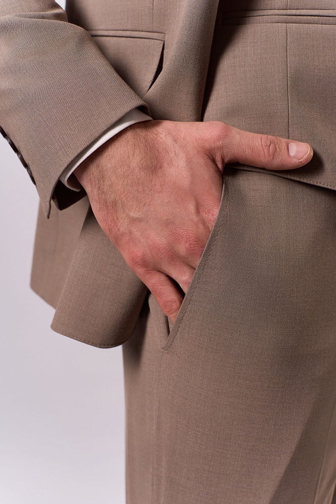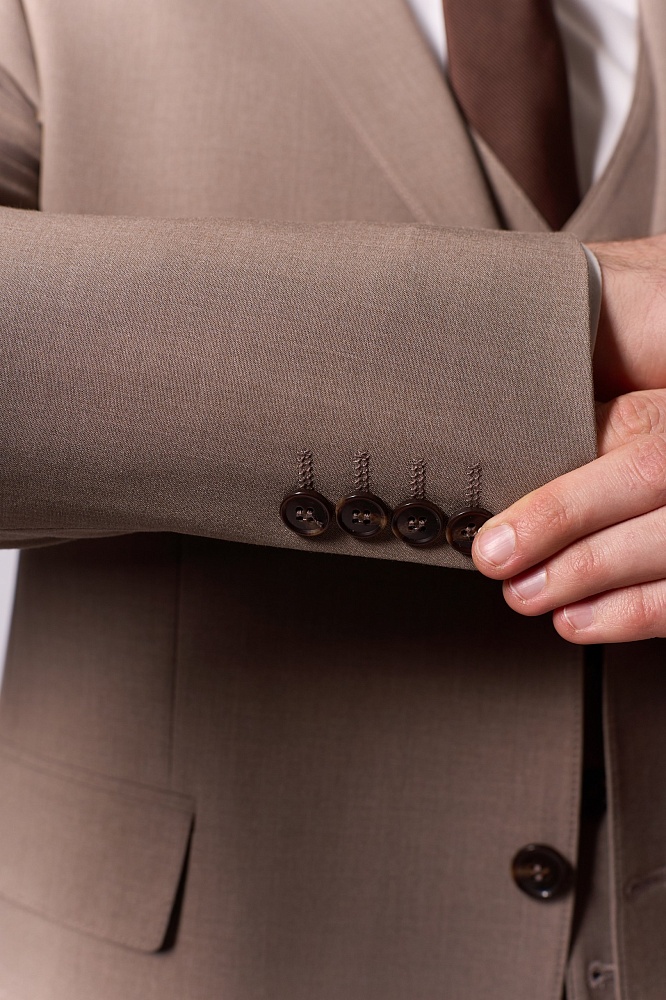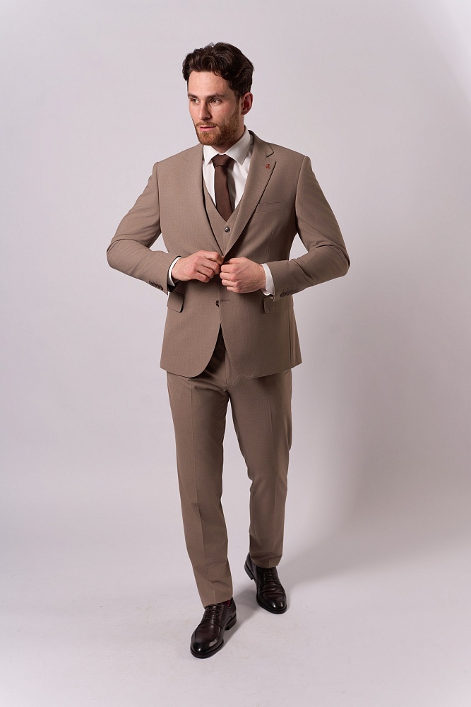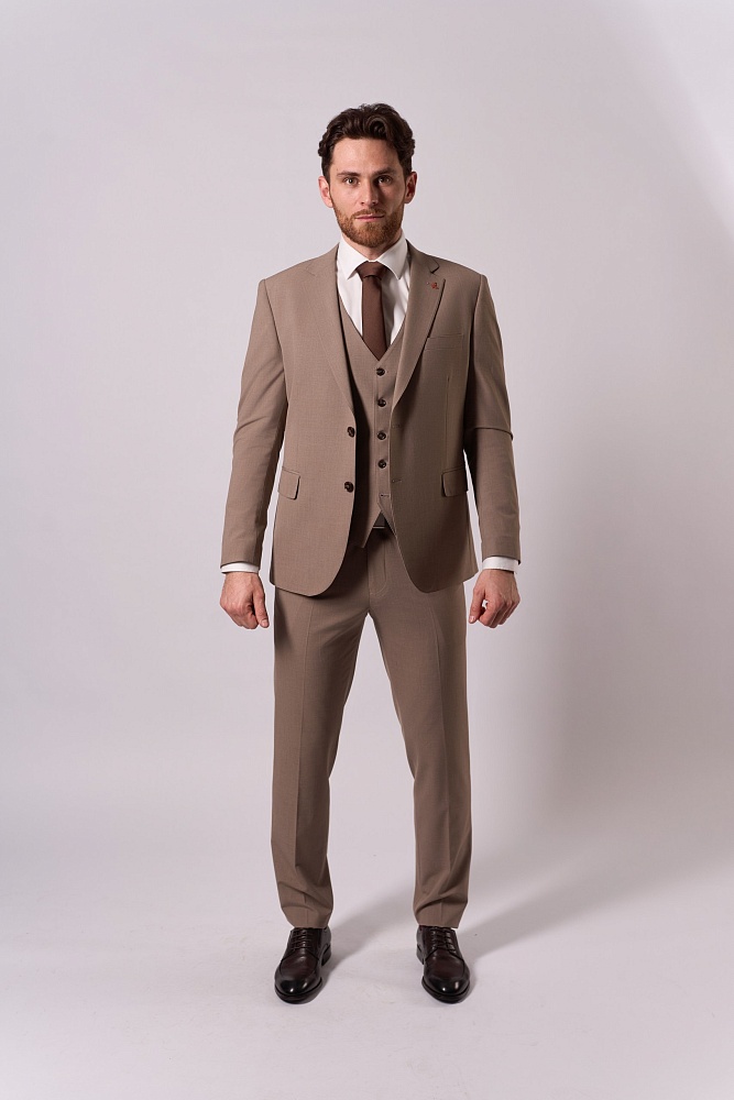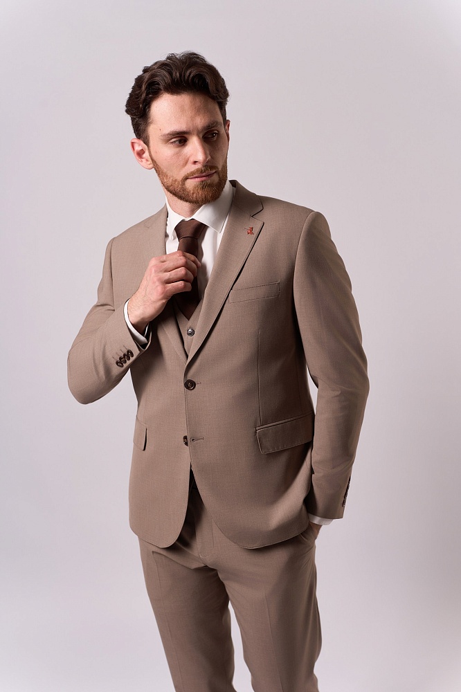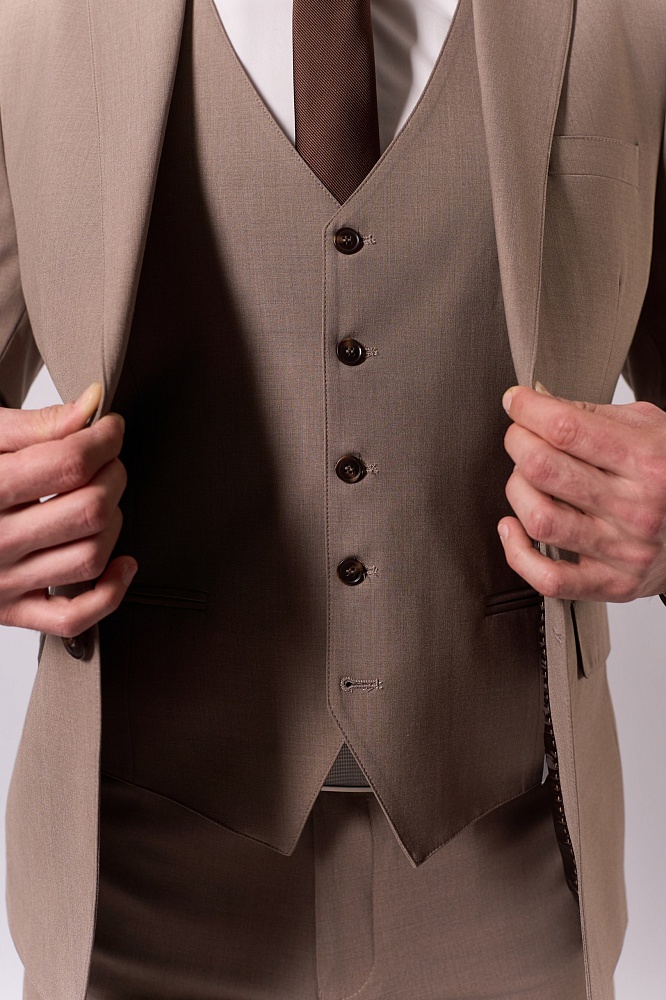 Элегантный бежевый костюм-тройка — воплощение классической утончённости для сезона весна–лето. Приталенный крой подчёркивает достоинства фигуры, создавая лаконичный и стильный силуэт. Состав ткани (40% шерсть, 30% вискоза, 25% полиэстер, 5% эластан) обеспечивает одновременно благородную текстуру и комфорт в носке — идеальный выбор для деловых встреч и торжественных мероприятий.