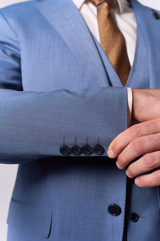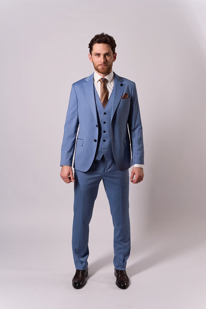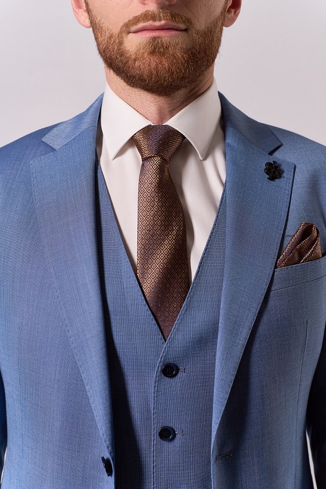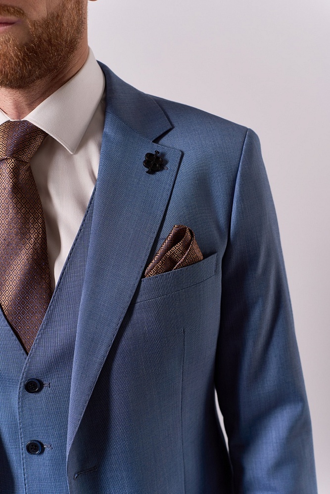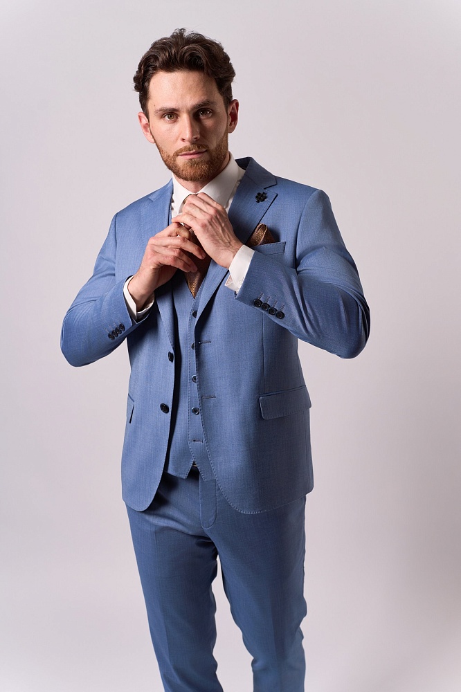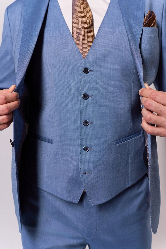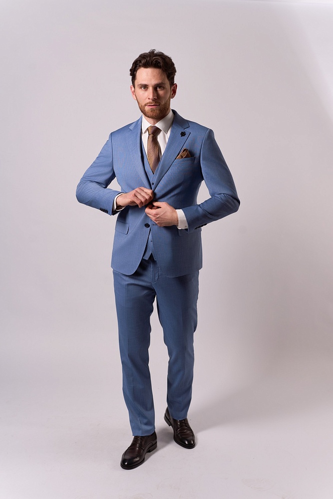 Элегантный синий костюм-тройка классического кроя — стильное решение для сезона весна–лето. Приталенный силуэт подчёркивает достоинства фигуры, создавая образ уверенного и респектабельного мужчины. Состав ткани (70% шерсть, 15% полиэстер, 15% вискоза) обеспечивает комфорт в носке: костюм не сковывает движения, отлично держит форму и приятен к телу. Идеальный выбор для деловых встреч, торжественных мероприятий и создания безупречного повседневного образа.