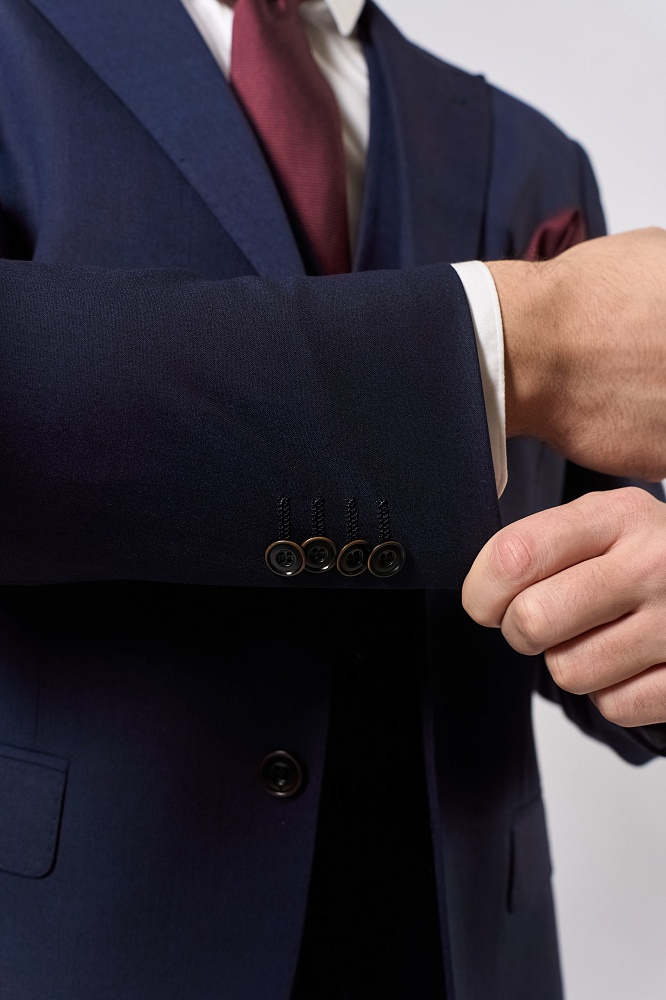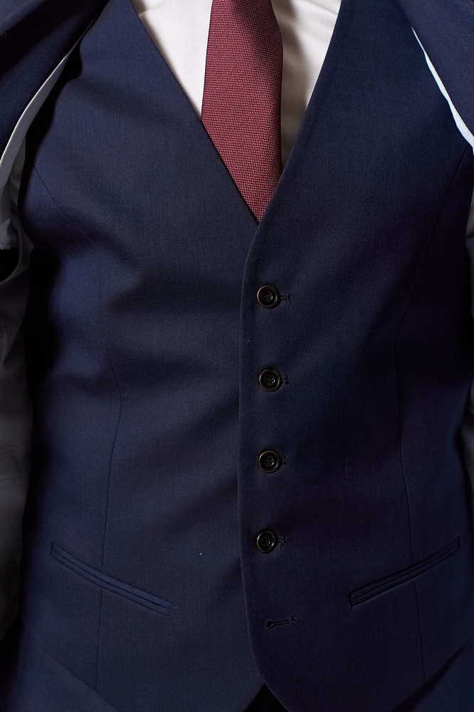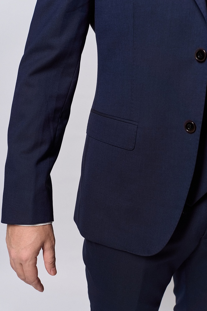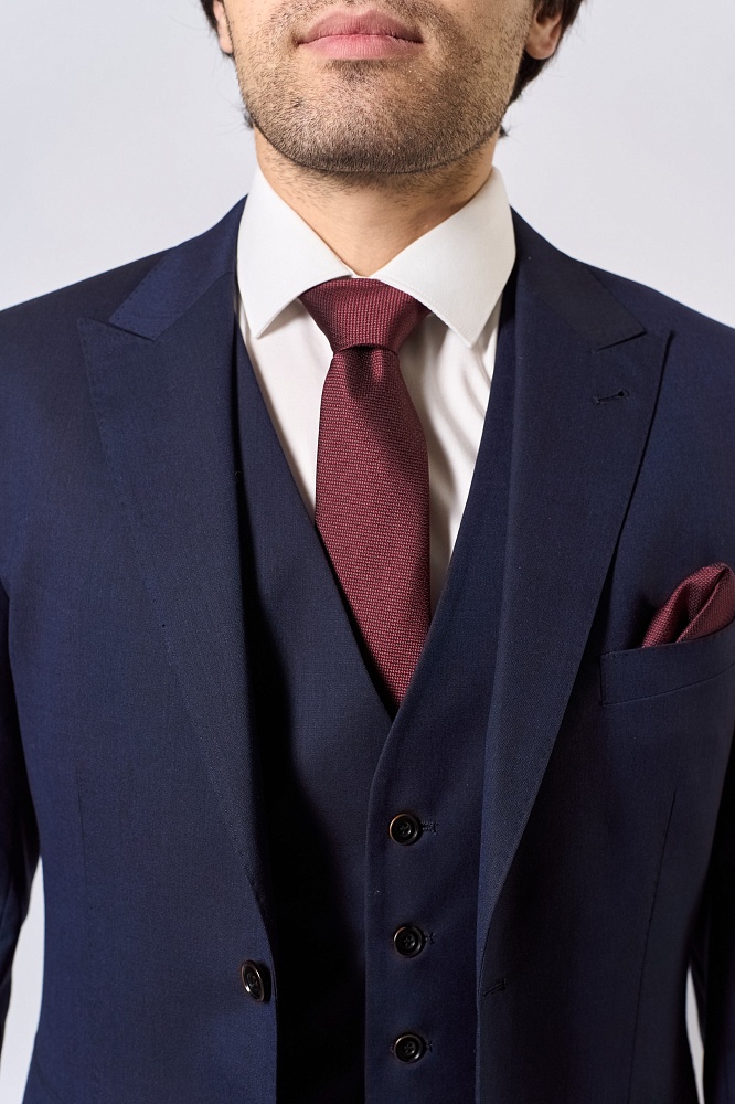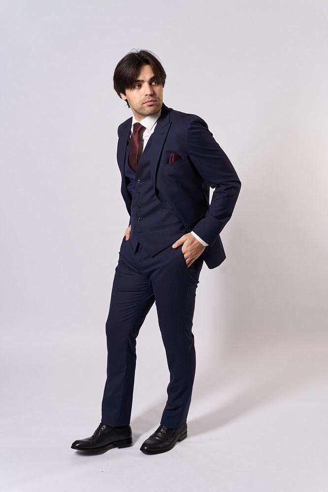 Классический мужской костюм-тройка тёмно-синего цвета — стильное решение для весны и лета. Приталенный крой подчёркивает фигуру, не сковывая движений, а однотонный дизайн делает модель универсальной для деловых встреч и торжественных мероприятий. Костюм изготовлен из комфортной ткани (63% полиэстера, 33% вискозы, 4% эластана), которая отлично держит форму. Сочетайте с белой или светло-голубой рубашкой и классическими туфлями для безупречного образа.