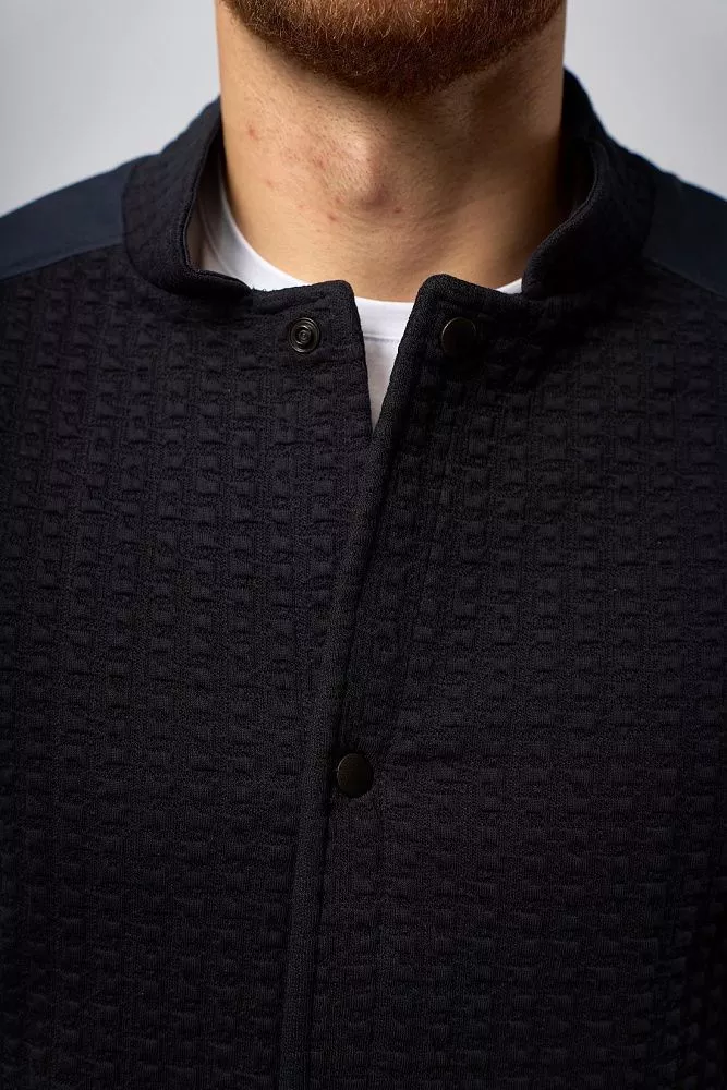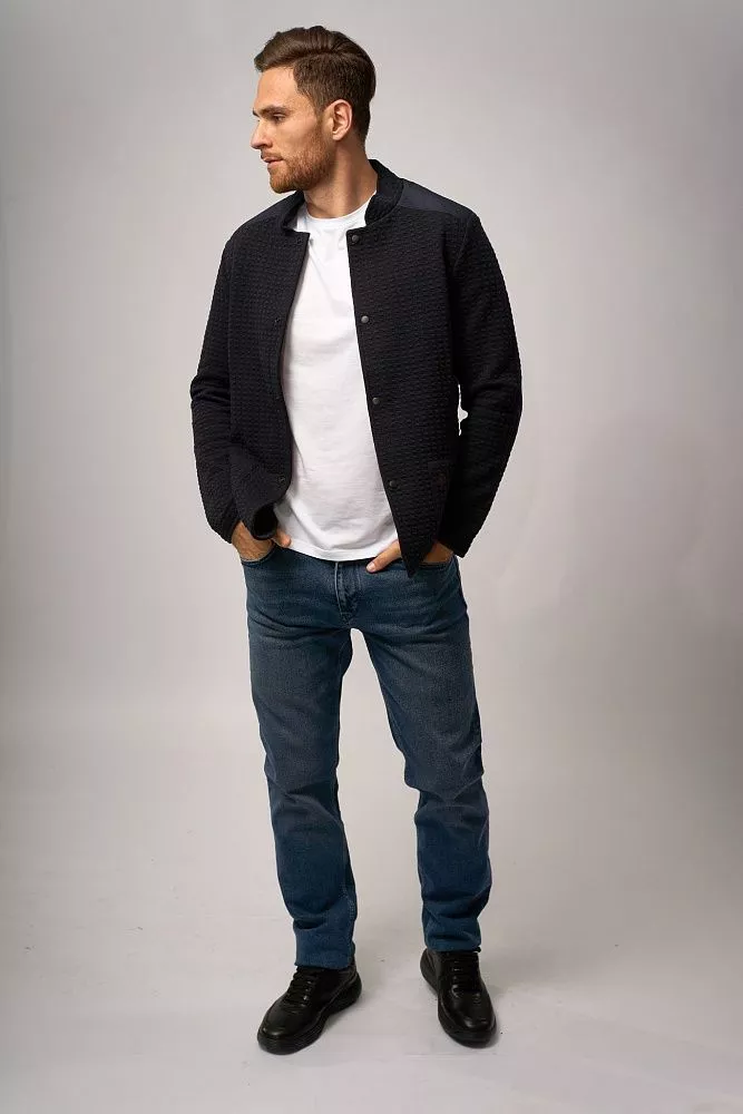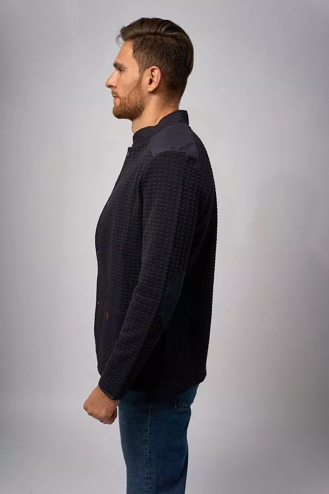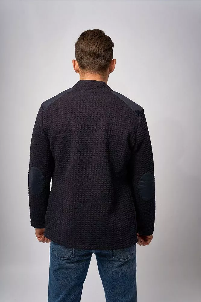 Стильный мужской пиджак «Кристиан» в синем цвете с оригинальным рисунком — выразительная модель в стиле casual для осенне-зимнего сезона. Приталенный силуэт, воротник-стойка, клёпки вместо пуговиц и декоративные заплатки на рукавах создают современный образ. Материал высокого качества (60% хлопок, 37% полиэстер, 3% эластан) обеспечивает комфорт и долговечность изделия, делая его идеальным выбором для создания непринуждённых, но стильных образов.