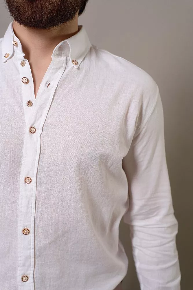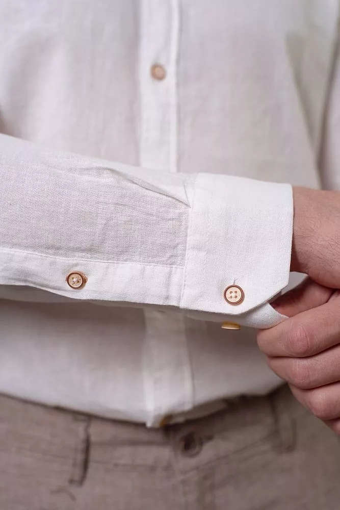 Эта белая льняная рубашка подарит вам ощущение непревзойденной свежести и комфорта даже в самые жаркие дни. Длинный рукав можно легко подвернуть для создания непринужденного образа или оставить для защиты от солнца. Контрастные бежевые пуговицы добавляют изысканности, а защип на спине обеспечивает дополнительную свободу движений. Прямой крой гарантирует расслабленную, но при этом аккуратную посадку, легко вписывающуюся в любой гардероб. Носите ее как с классическими брюками, так и с шортами, чтобы всегда выглядеть стильно и чувствовать себя комфортно.
