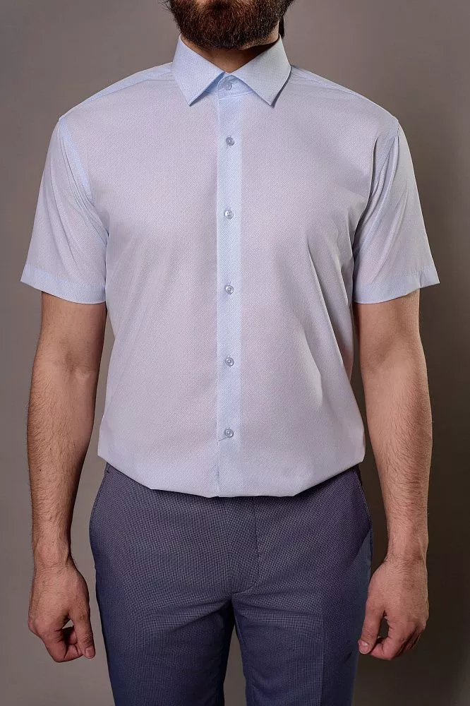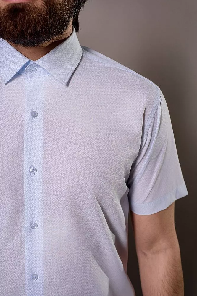 Освежите свой летний гардероб этой стильной рубашкой с коротким рукавом, которая придаст вашему образу легкость и оригинальность. Ее легкая и шелковистая ткань с интересным светло-голубым микропринтом обеспечит вам невероятный комфорт и прохладу весь день. Приталенный крой выгодно подчеркнет вашу фигуру, создавая аккуратный и современный силуэт. Сочетание бамбука, хлопка и микрополиэстера гарантирует долговечность, превосходную посадку и легкость в уходе.