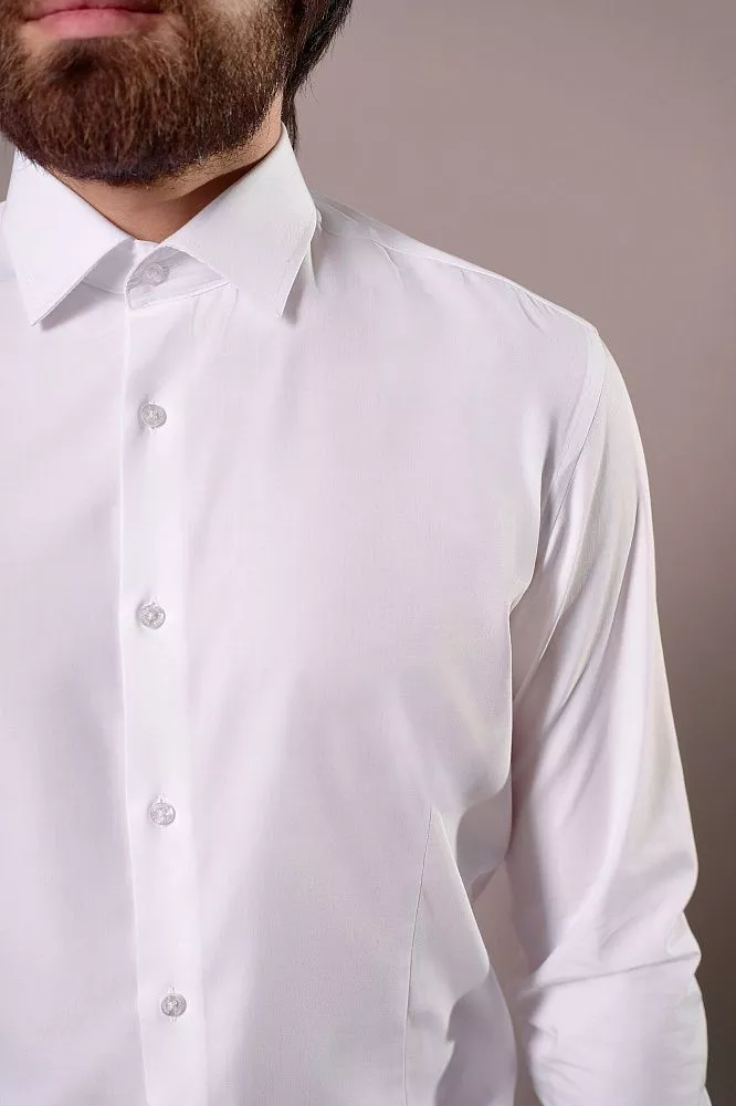 Белая рубашка мгновенно создаст ваш безупречный и стильный образ для любого случая. Ее гладкая, шелковистая текстура из бамбука и хлопка подарит вам невероятный комфорт на весь день. Приталенный крой идеально подчеркнет фигуру, а добавление микрополиэстера обеспечит легкость в уходе и долговечность.