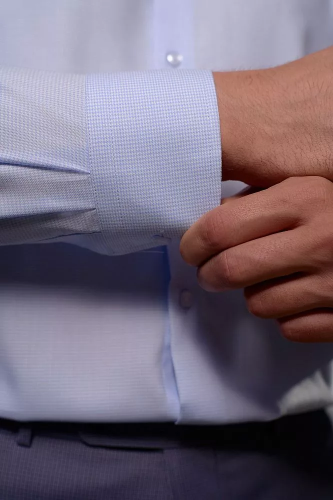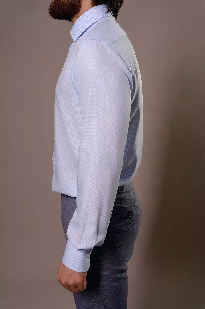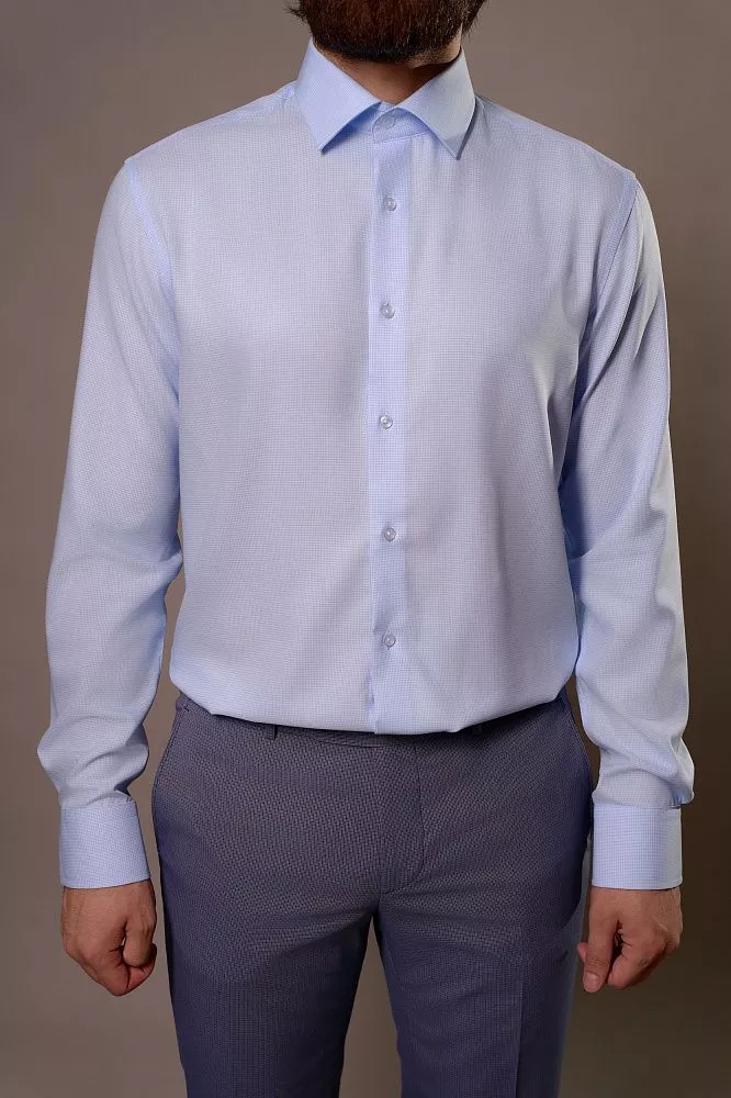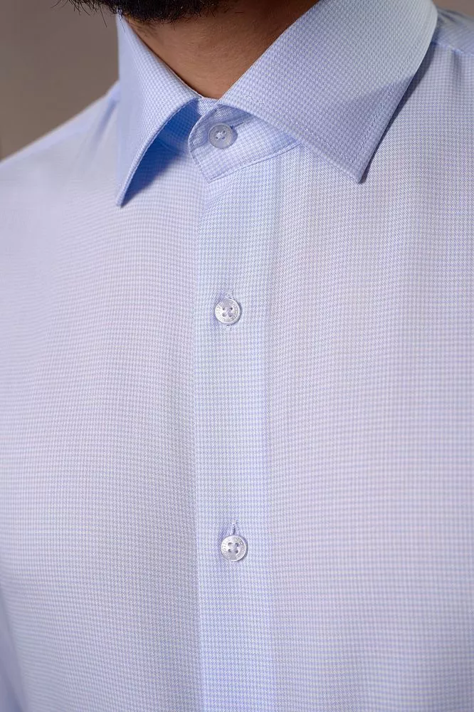 Добавьте изысканности в ваш повседневный или деловой образ с этой рубашкой. Её утонченный нежно-голубой микропринт моментально выделит вас из толпы. Наслаждайтесь превосходным комфортом благодаря легкой и шелковистой ткани из бамбука и хлопка, идеальной для ношения в течение всего дня. Приталенный крой элегантно подчеркнет фигуру, а благодаря микрополиэстеру рубашка сохранит безупречный вид и будет проста в уходе.