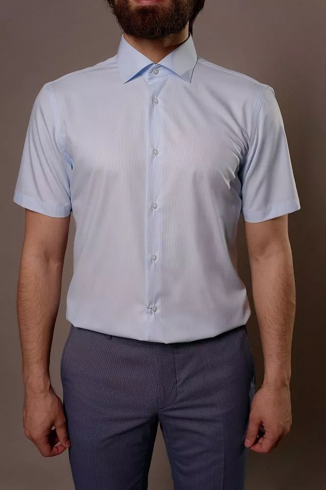 Создайте безупречный и комфортный образ с нашей классической рубашкой с коротким рукавом, идеально подходящей для теплой погоды. Ее легкая ткань обеспечит вам прохладу и свободу движений в течение всего дня. Нежная голубая микрополоска добавит вашему стилю изысканности, легко сочетаясь с любыми брюками. Приталенный крой выгодно подчеркнет вашу фигуру, а сочетание вискозы и полиэстера гарантирует долговечность и простоту в уходе.