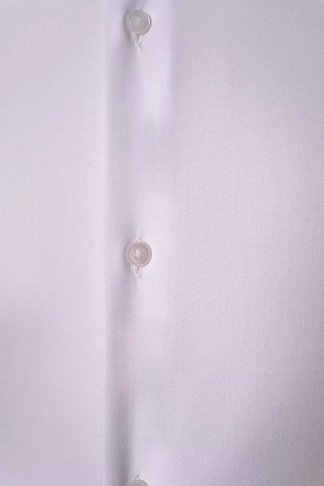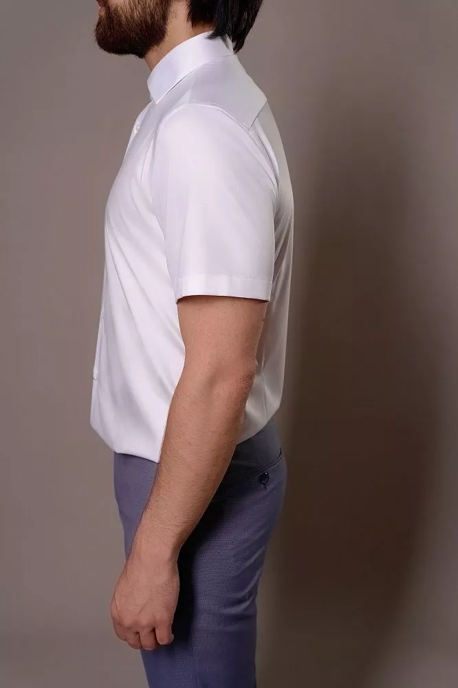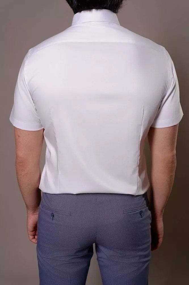 Ощутите исключительный комфорт и роскошную мягкость в этой безупречной белой классической рубашке с коротким рукавом. Гладкая шелковистая ткань из бамбука, полиэстера и эластана гарантирует идеальную воздухопроницаемость и свободу движений, даря вам легкость весь день. Приталенный крой безупречно подчеркнет вашу фигуру, создавая элегантный и современный силуэт, который легко поддерживать в идеальном виде.