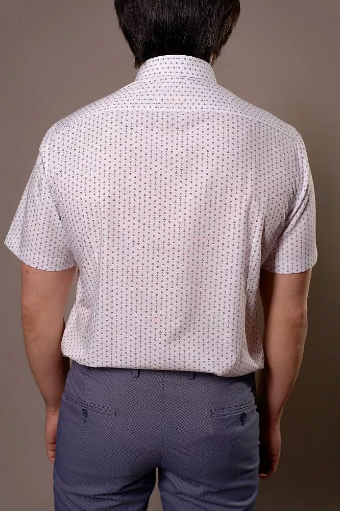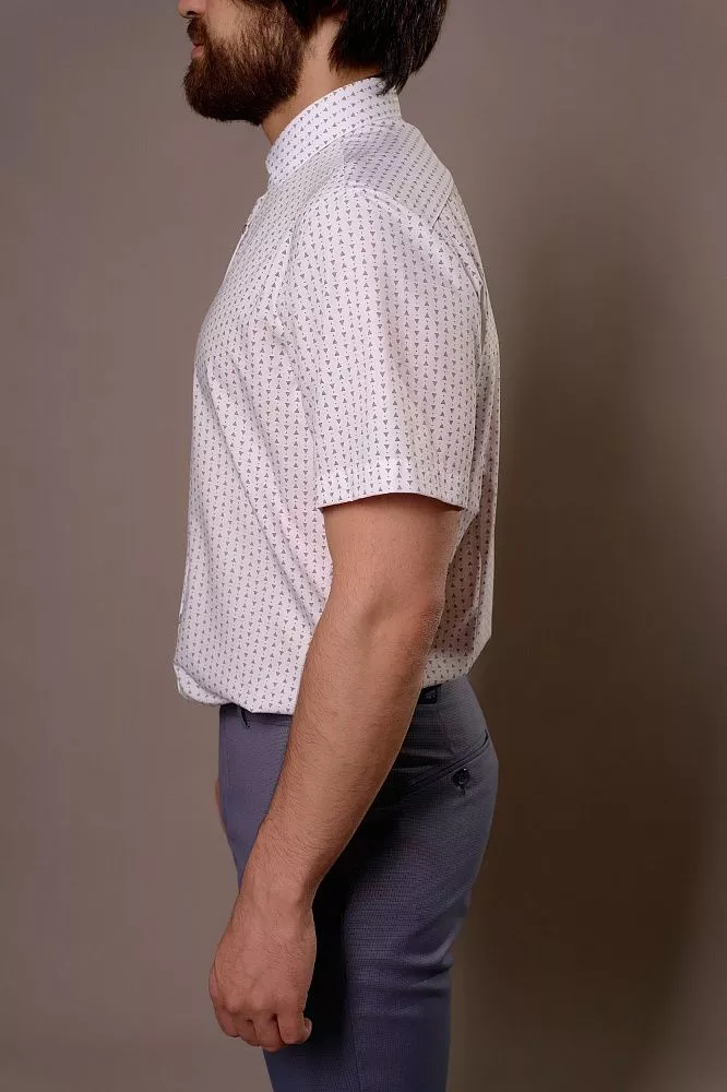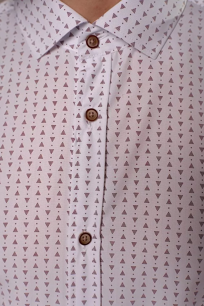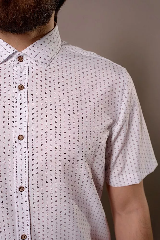 Придайте своему образу яркую индивидуальность с этой стильной рубашкой с коротким рукавом. Ее уникальный принт из бордовых треугольников на белом фоне и пуговицы с бордовой каймой создадут неповторимый акцент. Ощутите невероятный комфорт и свежесть благодаря легкой ткани из бамбука, которая идеально подходит для теплой погоды. Приталенный крой выгодно подчеркнет вашу фигуру, а оптимальное сочетание бамбука и полиэстера гарантирует долговечность и легкость в уходе.