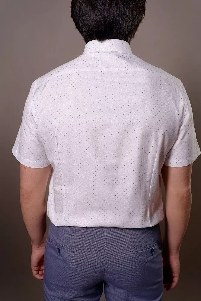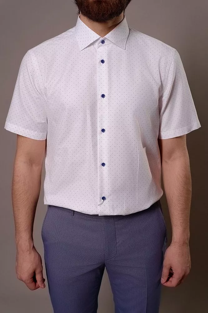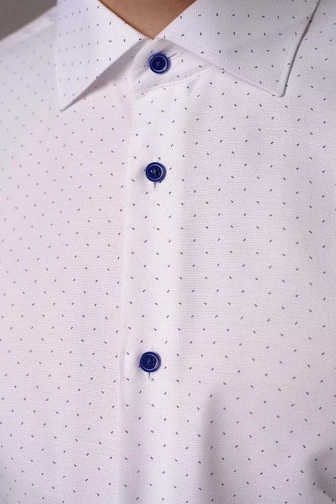 Освежите свой образ с этой стильной рубашкой. Белый фактурный фон с синим микропринтом мгновенно выделит вас из толпы, демонстрируя ваш отменный вкус. Сочетание хлопка и полиэстера обеспечивает идеальный дышащий комфорт на весь день и минимум усилий по уходу, экономя ваше время. Приталенный крой идеально подчеркнет фигуру, а гармоничные синие пуговицы завершат безупречный и современный силуэт.