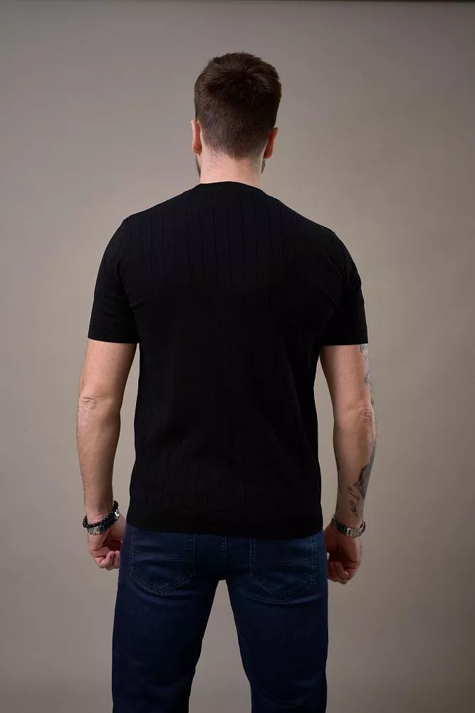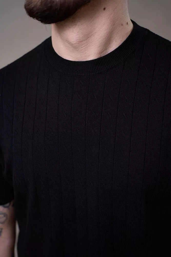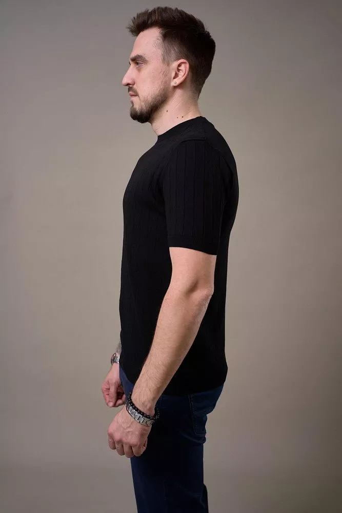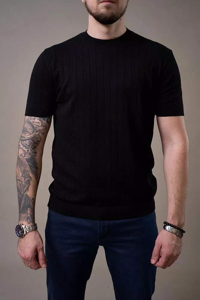 Базовая вещь, которая всегда актуальна – черная вязаная футболка. Полуприталенный крой обеспечивает комфортную посадку, не сковывая движений, и идеально подходит для любого типа фигуры. Мягкий, приятный к телу материал подарит ощущение комфорта весь день. Черный цвет – универсальный выбор, который легко сочетается с любыми вещами в вашем гардеробе.