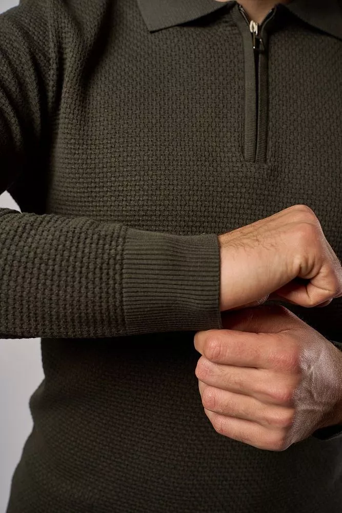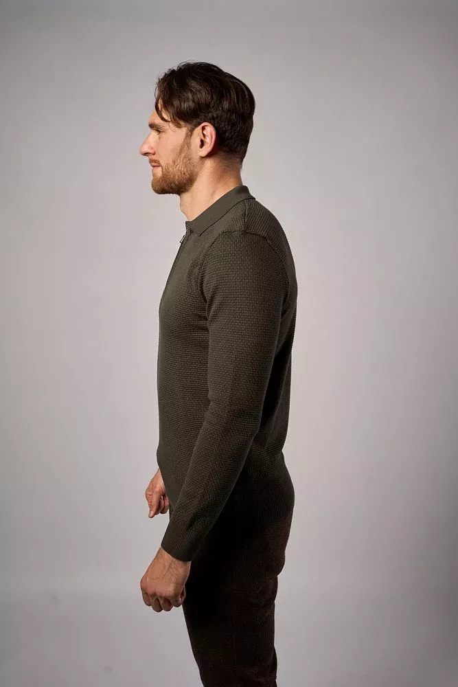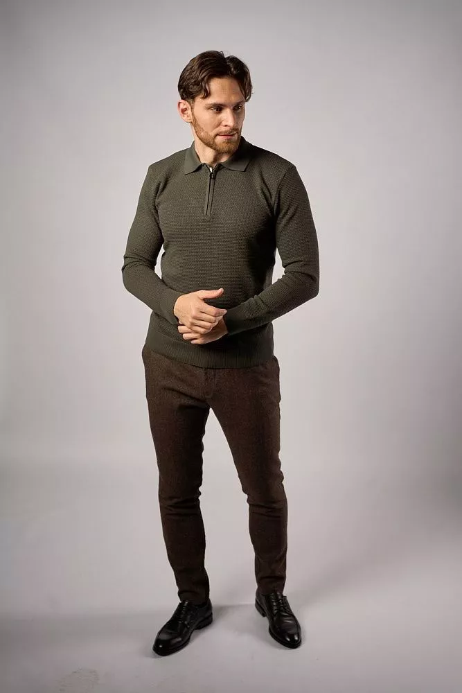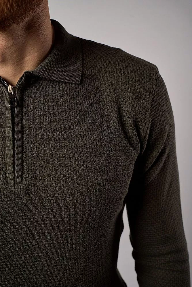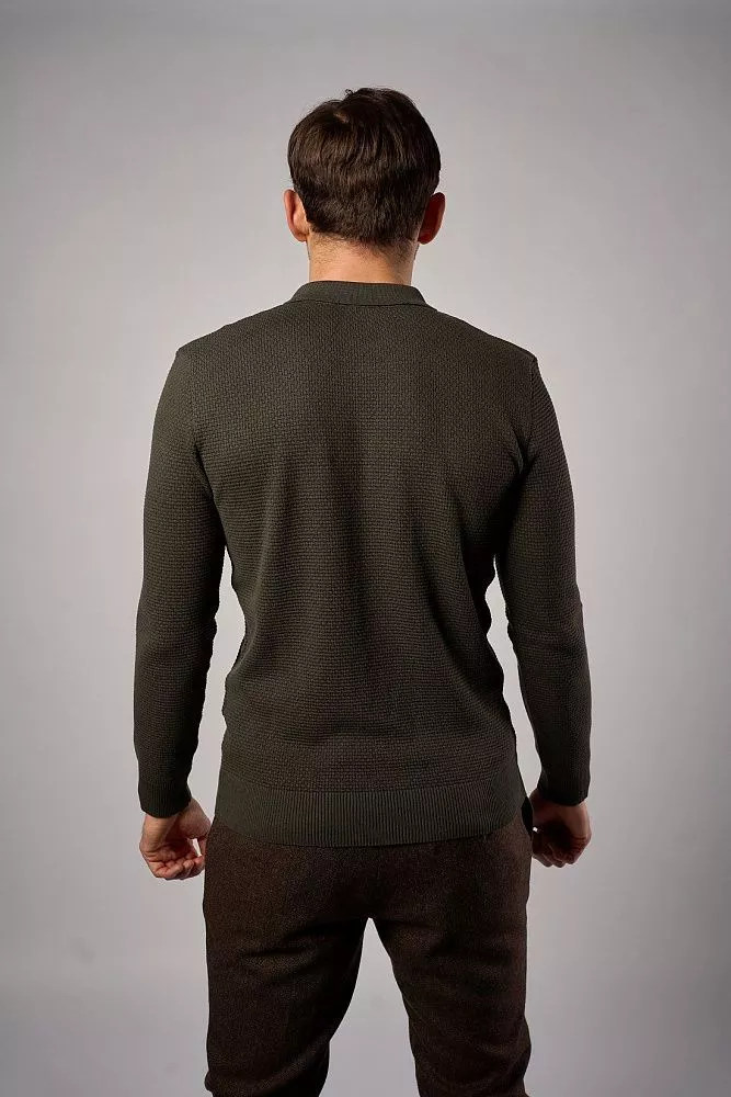 Мужской джемпер‑поло цвета хаки предназначен для осени и зимы. Модель с длинным рукавом выполнена из 100 % хлопка, имеет приталенный силуэт и отличается фактурной поверхностью с мелкой выработкой. Однотонный дизайн делает джемпер универсальным элементом гардероба. Комфортная посадка и качественные материалы обеспечивают удобство в носке в прохладное время года.