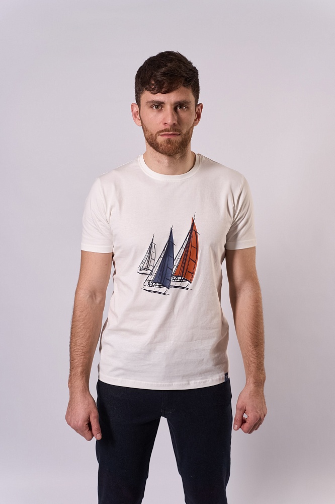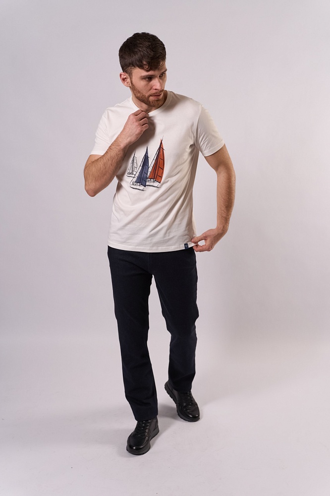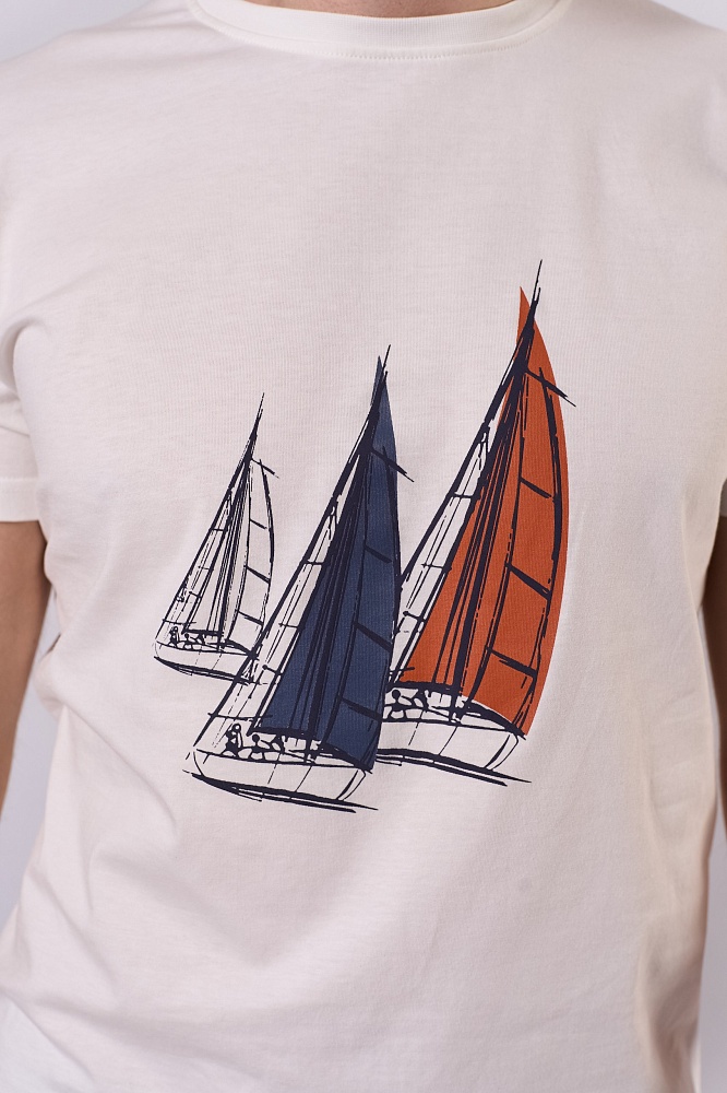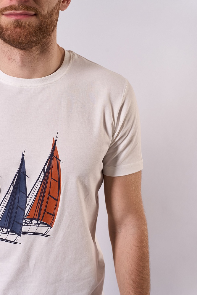 Стильная белая футболка с коротким рукавом — идеальный выбор для весны и лета. Приталенный крой подчёркивает фигуру, не сковывая движений, а яркий рисунок с изображением парусников придаёт модели особый шарм. Выполнена из 100% хлопка, что обеспечивает комфорт в жаркую погоду и отличную воздухопроницаемость. Практичная и универсальная вещь для повседневного гардероба — легко сочетается с джинсами, шортами и спортивными брюками.