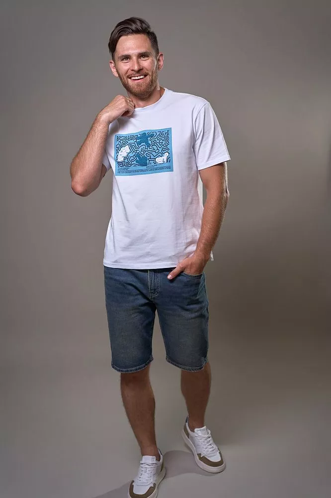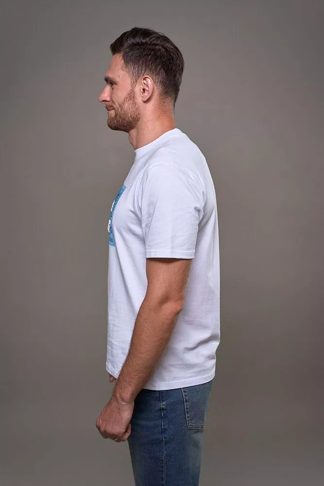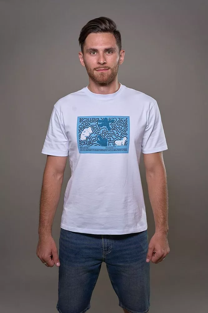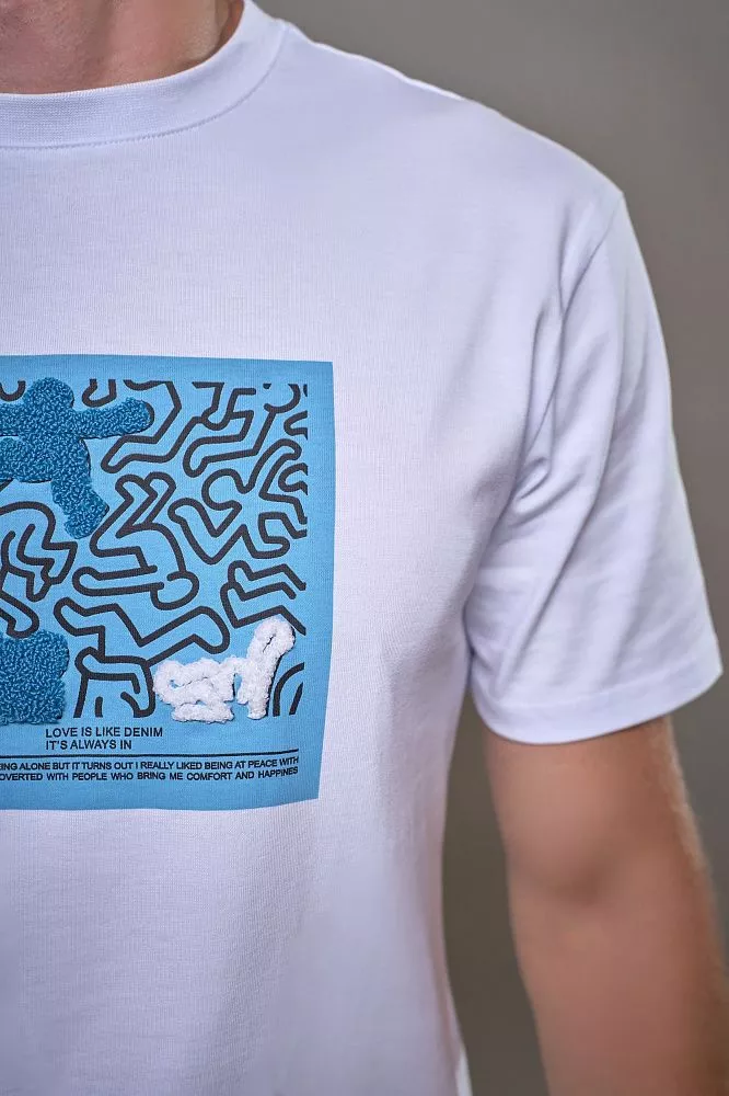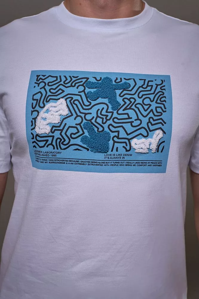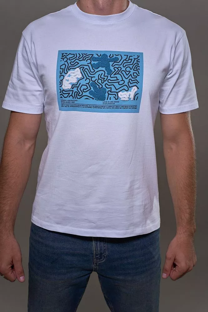 Обновите свой гардероб и выделитесь из толпы с нашей белой футболкой. Эффектный абстрактный принт голубого цвета на груди, дополненный объемными вставками, придаст вашему образу неповторимую индивидуальность. Выполненная из чистого хлопка, она обеспечит вам максимальный комфорт и приятные ощущения на весь день. Это идеальный способ добавить стиля и уникальности в повседневный образ.