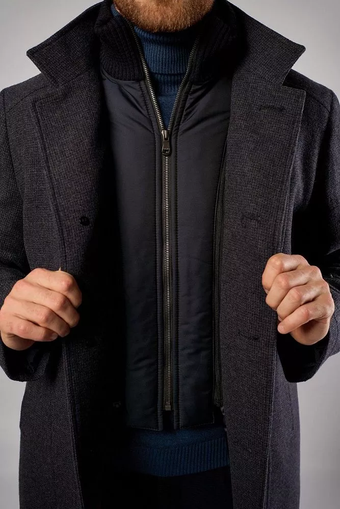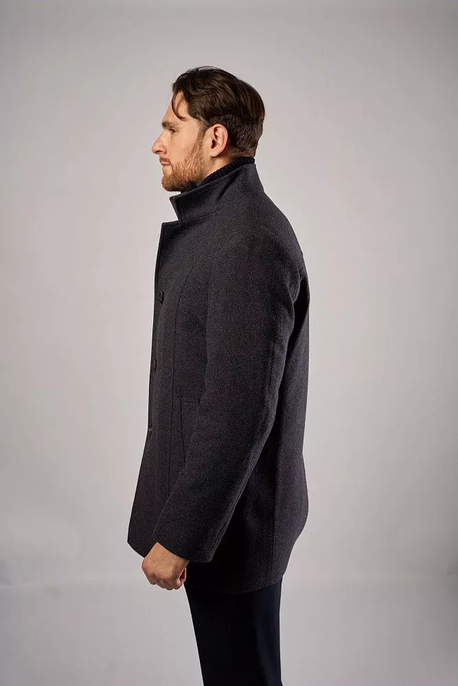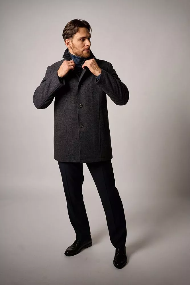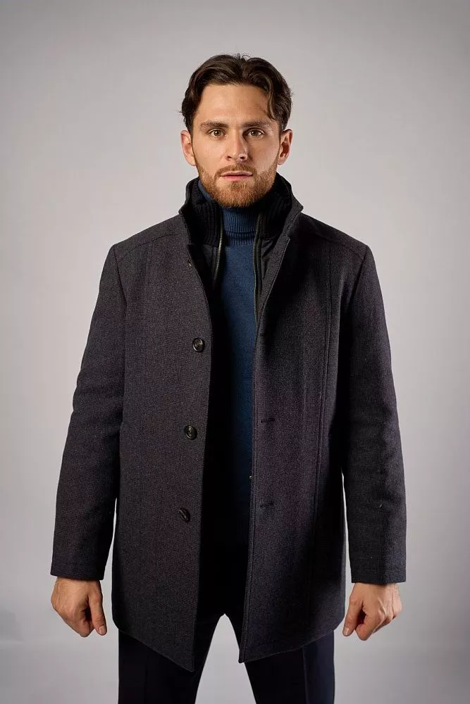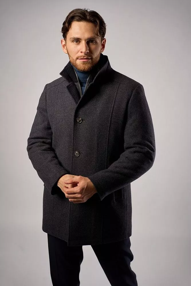 Мужское зимнее пальто в синем цвете сочетает классический стиль и комфорт. Прилегающий крой подчёркивает силуэт, длина — до середины бедра, что обеспечивает защиту от холода. Состав: 80% шерсти и 20% полиэстера — гарантирует тепло и износостойкость. Особенность модели — манишка с трикотажным воротником для дополнительной защиты от ветра. Универсальное решение для деловых и повседневных образов в холодное время года.
