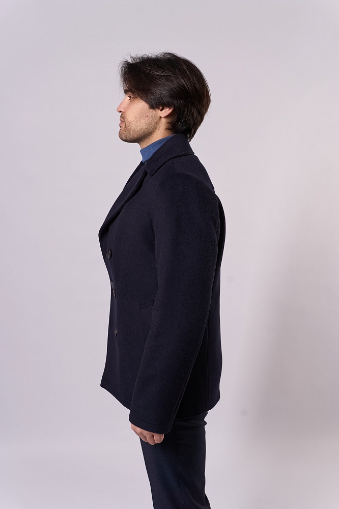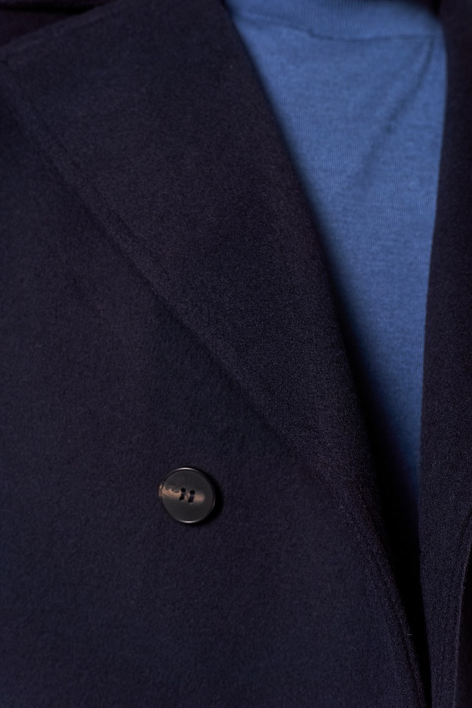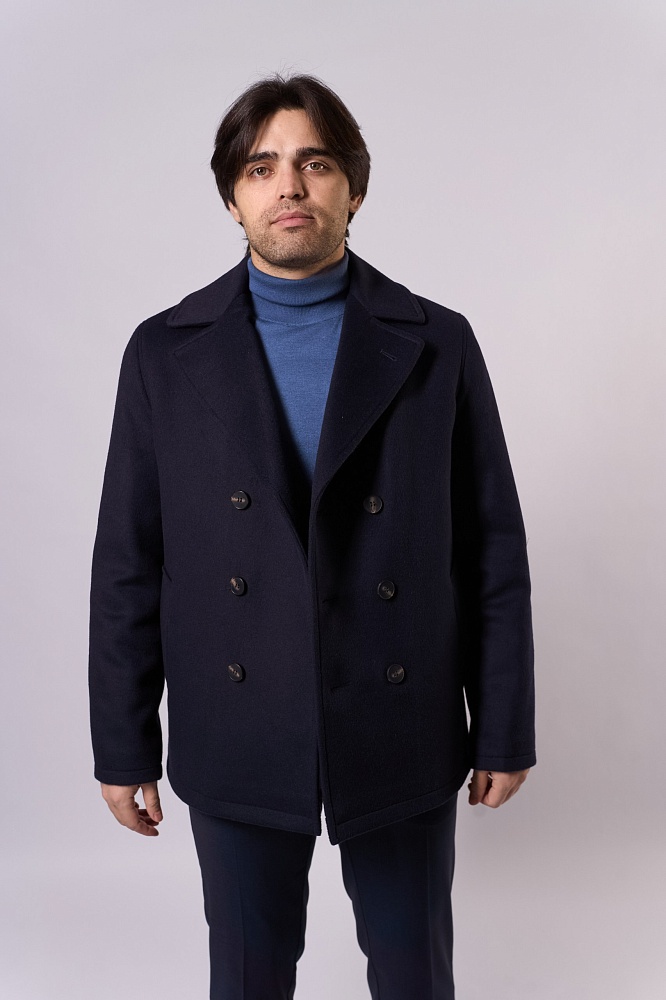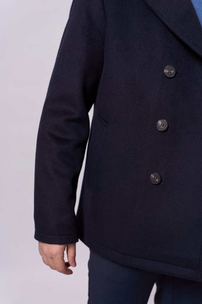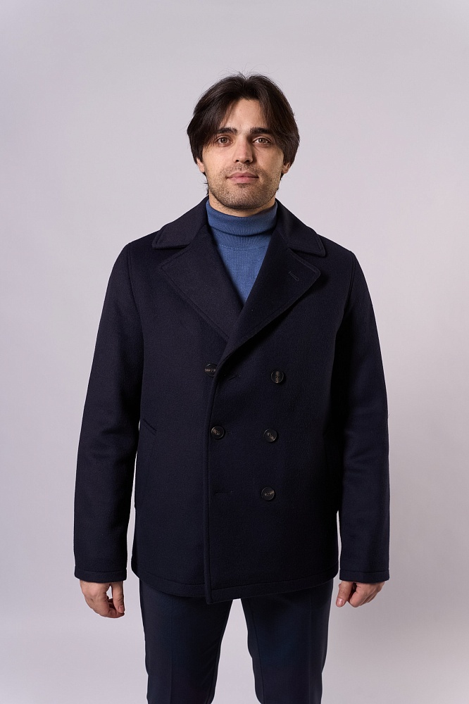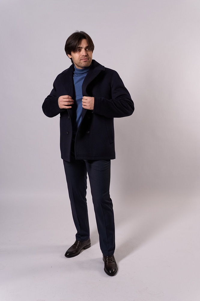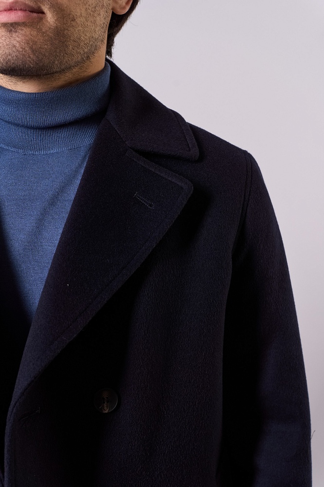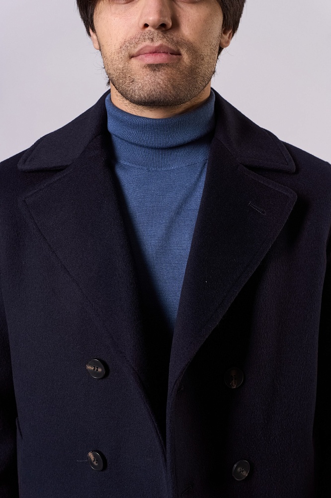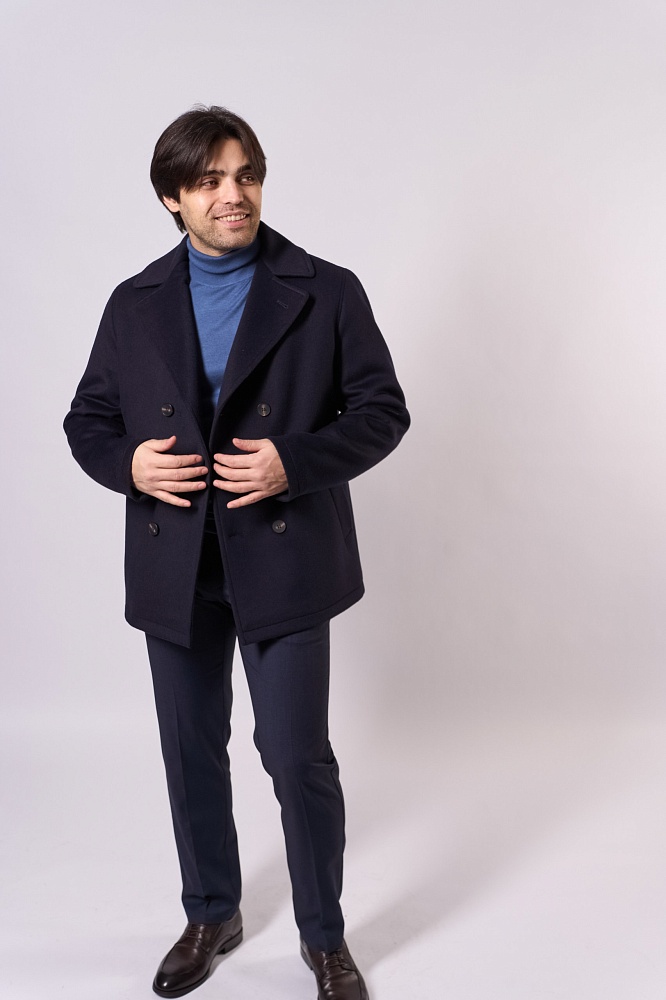 Элегантное тёмно-синее демисезонное пальто прямого силуэта — стильное решение для прохладной погоды. Двубортная модель с крупными пуговицами и выразительным воротником придаёт образу строгость. Изготовлено из смеси 80% шерсти и 20% полиэстера, без наполнителя — идеально для межсезонья. Короткая длина обеспечивает свободу движений, отлично сочетается с классическими брюками и свитерами.